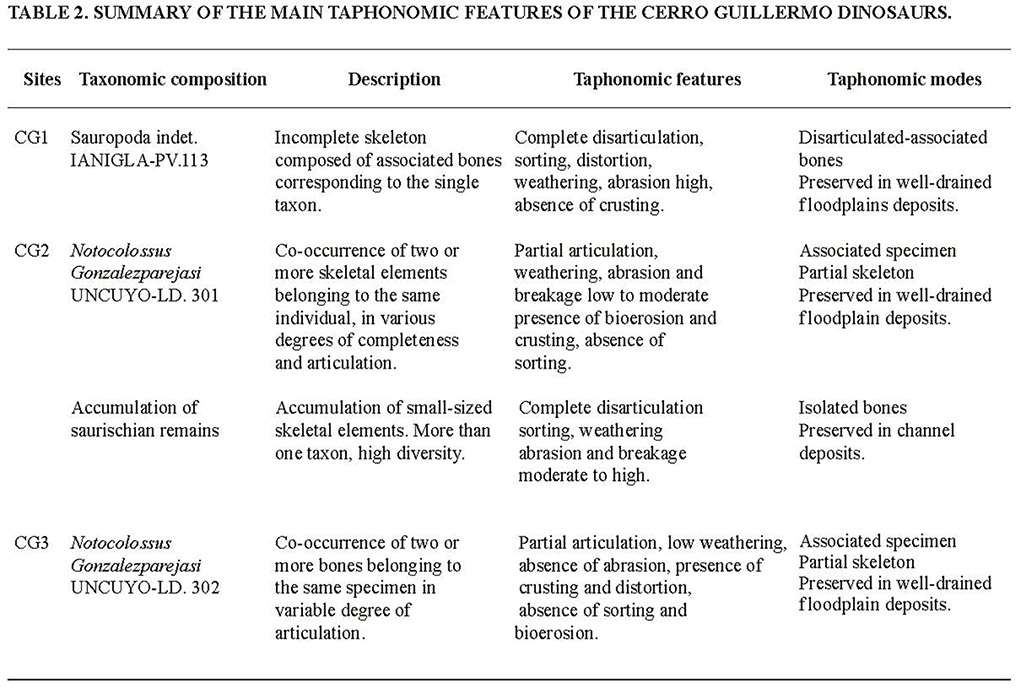 The specimen found in the CG2 site was preserved very close to the death site, within the same area, with a short pre-burial phase. Since the bones remained for some time on the surface, they underwent processes of dispersion, subaerial biodegradation, weathering, bioerosion and crusting. The absence of sorting by shape and size in the bones as well as of preferential orientations indicate scarce hydraulic transport processes. In this case, evidences suggest biological intervention (predators and/or scavengers) as dispersing agents. These parautochthonous fossil assemblages resulted from the decay and burial of partially complete carcasses.