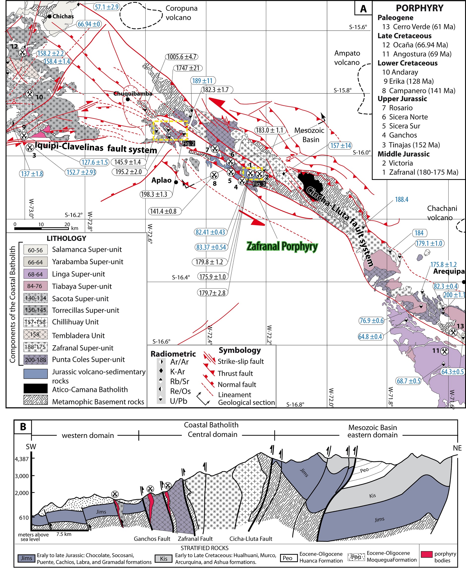 Since ca. Mid-Mesozoic (200-90 Ma), the Andean evolution seems to be more directly controlled by plate convergence (Coira et al., 1982; Thorpe, 1984; Allmendinger et al., 1997; Ramos and Aleman, 2000). It was dominated by periods of intracontinental rifting (Petford and Atherton, 2003) and formation of a well-defined intra-arc and back-arc basins (Coira et al., 1982; Atherton et al., 1983; Davidson and Mpodozis, 1991). Mesozoic intra-arc and back-arc rifts were filled vertically up through axial faults by magmas derived from the upper mantle or lower crust (Couch et al., 1981; Atherton et al., 1983, 1985), as well as sedimentary detritus derived from the rift margins, volcanic edifices (Benavides, 1956) and locally interbedded calcareous sedimentary rocks (Benavides, 1962). Marine sedimentation continue more or less uninterruptedly from the Jurassic into the early Cretaceous (Benavides, 1956). The rifting along the western margin of Peru were controlled by regional-scale axial fault systems, which correspond to the NW-striking Cincha-Lluta Fault System (CLFS) (Carlotto et al., 2009a; Simmons et al., 2013), which was active during batholith construction (Demouy et al., 2012). This fault system is equivalent to the Icapuquio Fault System (IFS) farther south in Peru (Wilson and García, 1962; Vargas, 1970; Vicente et al., 1979; Jacay et al., 2002), which controls the spatial distribution of most of the porphyry Cu-Mo deposits, including the Zafranal porphyry district (Fig. 1). Furthermore, Zafranal porphyry copper is located very close to the intersection with the Iquipi-Clavelinas Fault System (ICFS) of EW orientation.
