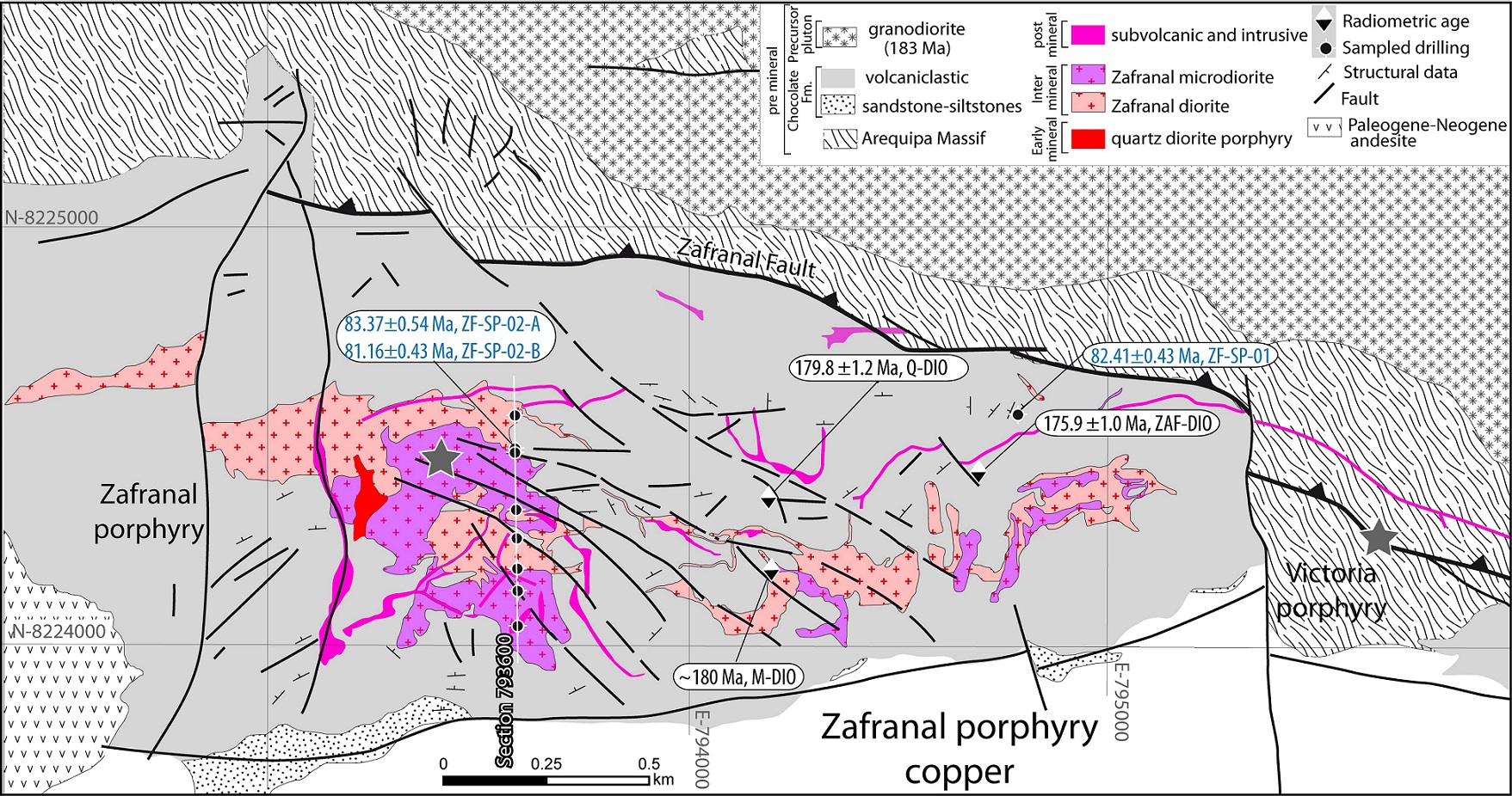 The Zafranal porphyry copper deposit is located approximately 90 km northwest of the city of Arequipa in southern Peru, it was first described by Tejada (2010). Measured and indicated resources amount >472.1 Mt, 0.36% Cu and @ 0.08 g/t Au (Fernandez-Baca, 2011). The Zafranal local geology was described by geologists of AQM Peru S.A.C. (De Ruijter et al., 2013) and summarized by Rivera et al. (2010), Rivera (2012a, b). Metamorphic rocks of the Arequipa Massif are the oldest rocks at Zafranal, cropping out largely along the shear zone of the NW-striking Zafranal reverse fault. The next younger units are volcano-sedimentary sequences of the Chocolate Formation comprised of sandstone and siltstones, which in turn are overlain by tuffs, breccias and andesitic lava flows (Rivera et al., 2010; Fig. 3), which are present as roof pendants in igneous intrusions. Several roof pendants and large blocks of volcano-sedimentary sequences are present in the pre-mineralization diorites-granodiorites, which form the northern margin of the Zafranal porphyry. Alteration and mineralization at Zafranal is centered on porphyritic dykes and stock complexes, ranging in composition from diorite to quartz diorite, which show potassic alteration dominated by biotite (Tejada, 2010). The older porphyry suite (Zafranal diorite) host copper mineralization, displaying intense sericitic alteration overprinted on potassic alteration (Rivera et al., 2010), including typical A-type chalcopyrite-pyrite and B-type chalcopyrite-molybdenite quartz veinlets, and D-type quartz-pyrite-chalcopyrite veinlets with sericitic halos (cf. Gustafson and Hunt, 1975). An outer propylitic halo with epidote-chlorite, approximately 400 m wide, is present to the north (Rivera, 2012a). A 40Ar/39Ar plateau age of 82.41±0.43 Ma was obtained for hydrothermal biotite of the Zafranal diorite (Rivera, 2012a), located close to the east of the Zafranal porphyry system (Fig. 3). A microdiorite porphyry cut the Zafranal diorite, and is characterized by a much weaker potassic alteration towards depth, sparse A-, and B-type veinlets, containing 0.35-0.40 percent Cu in the hypogene mineralization (Rivera et al., 2010). A 40Ar/39Ar plateau ages of 83.370±0.54 and 81.16±0.43 Ma were obtained for hydrothermal biotites (Rivera, 2012a), in a microdiorite located in the central part of the Zafranal porphyry system (Fig. 3). Post-mineral intrusions diorite and diorite-monzodiorite dykes, displaying only weakly propylitic alteration with pyrite and chalcopyrite dissemination (Rivera, 2012a). However, U-Pb data presented herein demonstrates that the porphyries are temporally related to an early Jurassic magmatism.