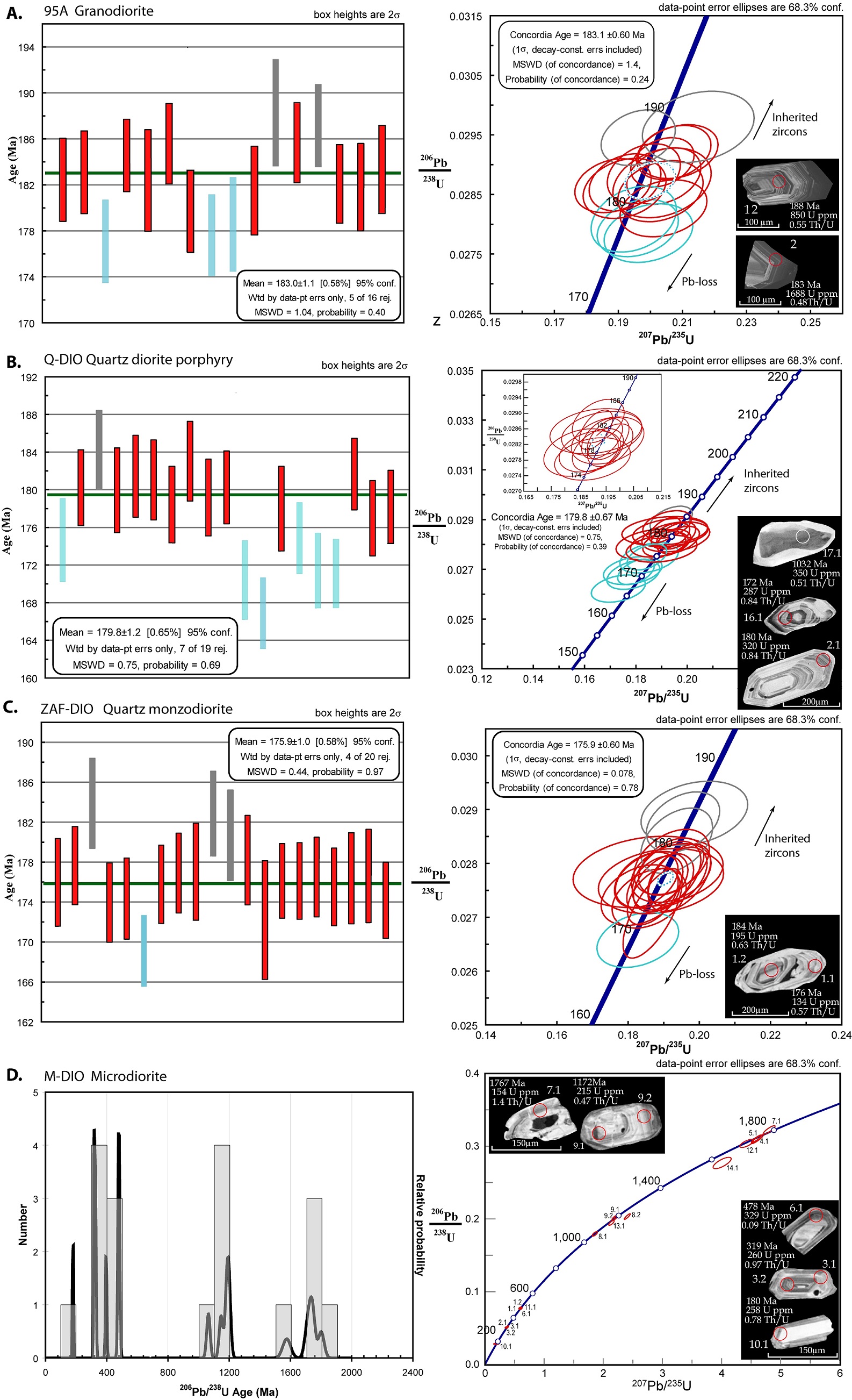 Precursor pluton. A hypidiomorphic granular granodiorite (95A, Zafranal Super-unit) at the Zafranal porphyry district, taken from approximately 4 km east of the center Zafranal porphyry and 2.5 km northwest of the Santo Domingo mining (gold-bearing quartz veins). In general it consists of slightly NW elongated pluton (Fig. 1), which extends to Cerro Torconta and reach the south of Arequipa. Based on field relations, the granodiorite intruded to gneiss and early diorites. The zircons of granodiorite are elongate (less than 210 µm in length) euhedral in shape. CL images show that most crystals with a prominent oscillatory zoning in the entire zircon population, but some few grains show core and rims with low-luminescence (Fig. 5A). The granodiorite yielded a U-Pb age of 183.0±1.1 Ma (Fig. 5A), based in eleven zircons of twenty points analyzed. Three spot analyses yielded younger dates (178 Ma), presumably due to Pb loss. The all crystal zircons analyzed display high-U (810-1900 ppm) and low Th/U values (0.5-0.8).