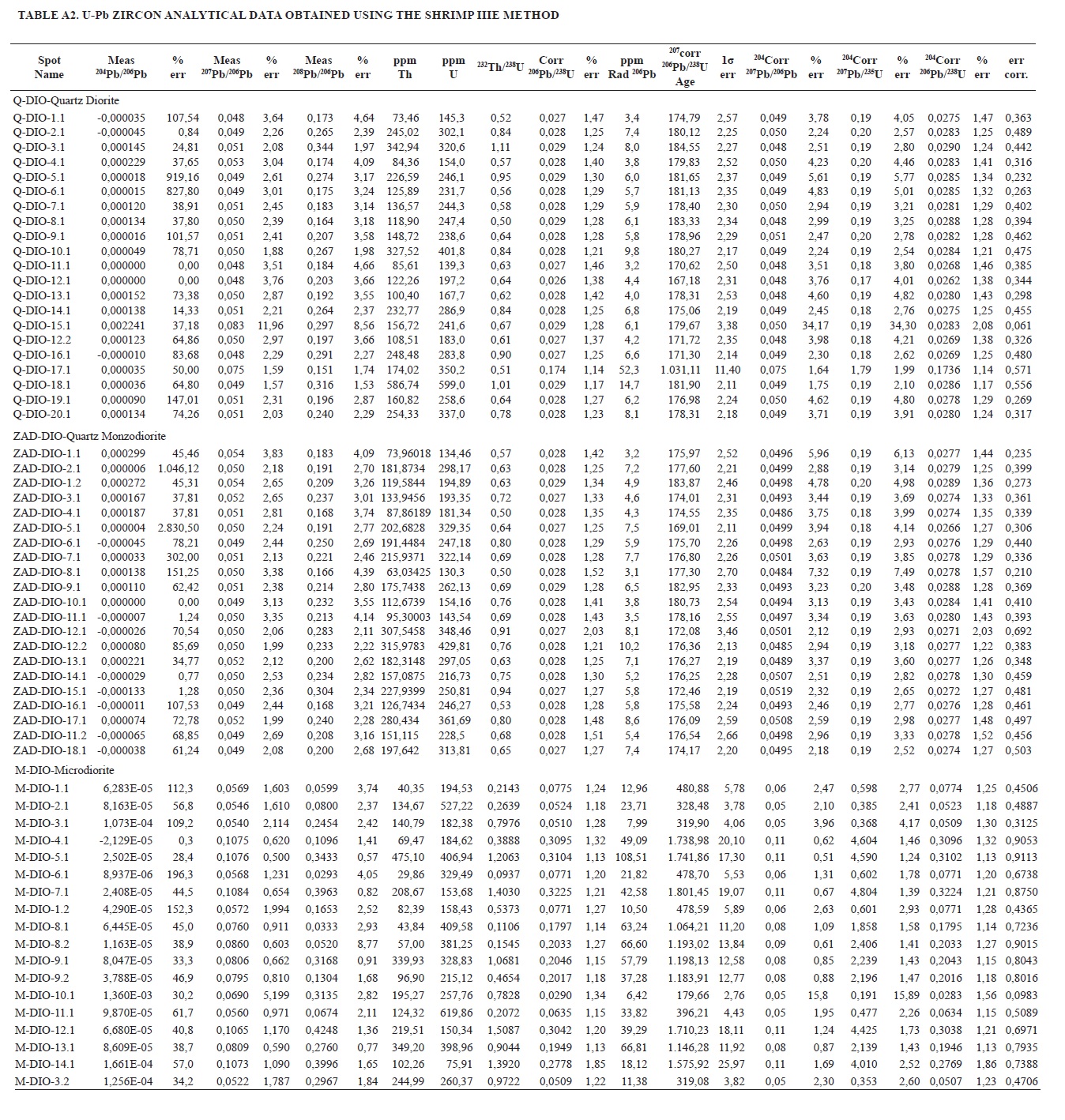 Early-mineral rocks. A quartz diorite porphyry (Q-DIO) at the Zafranal porphyry, taken from approximately 0.5 km east of the center of the porphyry copper (Fig. 3) present lower degree of hydrothermal alteration. The zircon crystals from this sample generally are clear and colorless and mostly elongate (less than 400 µm in length) sub-rounded to euhedral in shape, this combination of zircon shape suggests relatively rapid to moderate crystallization with a high-level emplacement. The CL images reveal an ocillatory zoning and some irregular zoning, but one zircon xenocrystal has internal structure different from the remaining ninteen zircons. The xenocrystal has homogeneous CL, with outermost invariably being a bright CL rim. Therefore, largely given the common nature of the zircon population. The quartz diorite porphyry, yielded a zircon U-Pb age 179.8±1.2 Ma (Fig. 5B), based on twelve of nineteen. Six zircons are younger due to Pb loss. The xenocrystal indentified in CL is much older, isotopic measurements indicate that it is an inherited xenocrystal dated at 1032±11 Ma, with low-U (350 ppm) a low-Th/U ratio (0.51), similar in age to those of the Arequipa Massif (Fig. 5B).
