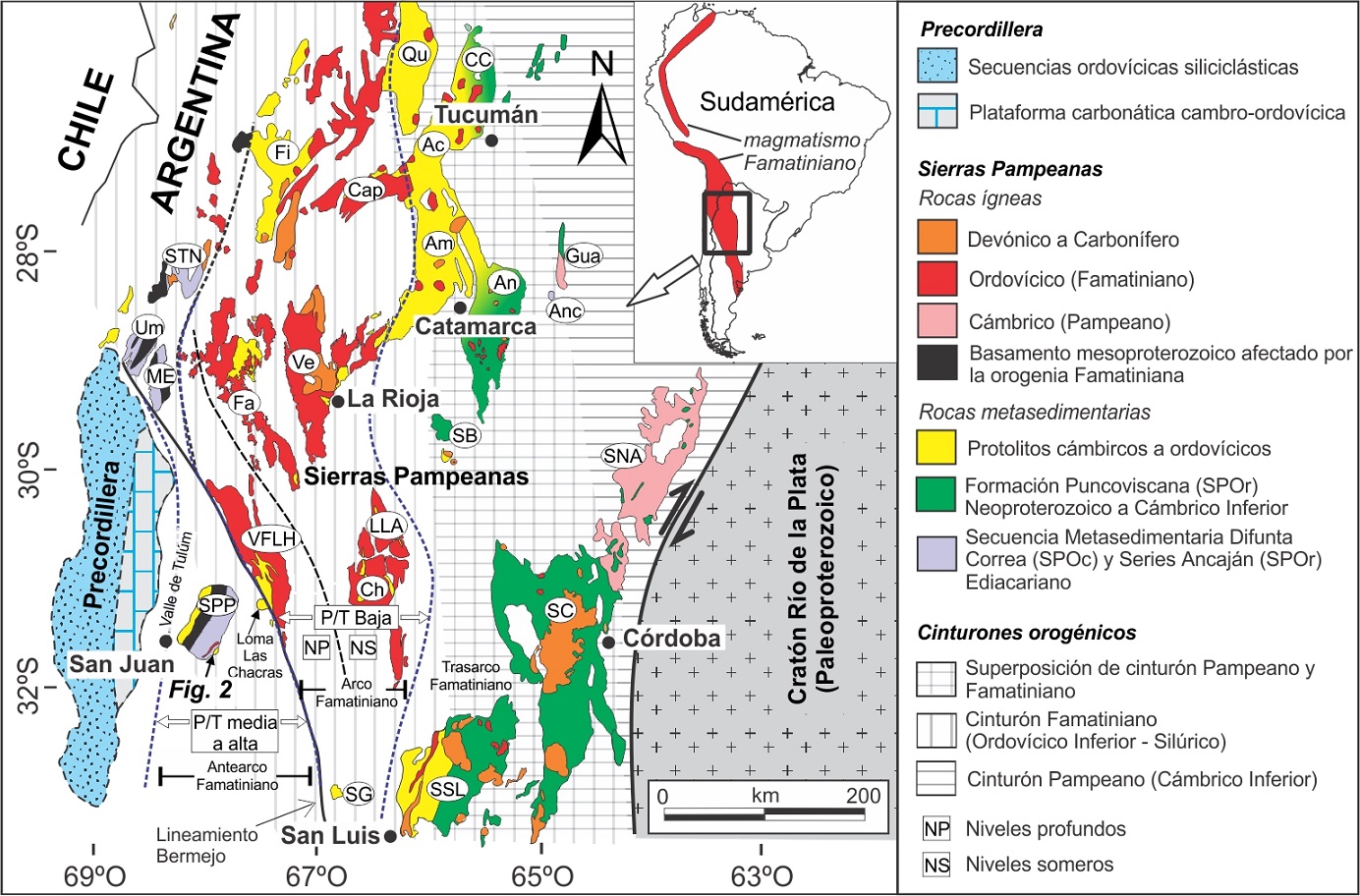 Las Sierras Pampeanas de Argentina constituyen un laboratorio natural excepcional donde se exponen rocas asociadas a procesos geológicos atribuidos a la formación y ruptura del supercontinente Rodinia (Meso-Neoproterozóico; e.g., Vujovich y Kay, 1998; Baldo et al., 2006; Colombo et al., 2009; Rapela et al., 2010; Varela et al., 2011) y a la formación de Gondwana (Neoproterozoico-Paleozoico Inferior; e.g., Rapela et al., 1998). Esta singularidad ocurre como consecuencia de la subducción plana de la placa de Nazca por debajo de la placa Sudamericana durante el Mioceno, entre los ca. 27º y 33º S la cual exhuma bloques de basamento ígneo-metamórfico en el antepaís andino (Jordan y Allmendinger, 1986). Durante el Paleozoico inferior se desarrollaron, en el margen suroeste (SO) de Gondwana, dos orogenias que se encuentran ampliamente representadas en las Sierras Pampeanas: orogenia Pampeana (Cámbrico Inferior) y orogenia Famatiniana (Ordovícico) (Fig. 1). La orogenia Pampeana se encuentra representada por un arco magmático calcoalcalino y rocas metamórficas de bajo a alto grado metamórfico de ca. 545-520 Ma (Casquet et al., 2018 y referencias allí citadas) mientras que la orogenia Famatiniana desarrolla un arco magmático de ca. 490-460 Ma (e.g., Pankhurst et al., 1998, 2000) y metamorfismo regional entre 480-440 Ma (e.g., Casquet et al., 2001; Lucassen y Becchio, 2003; Steenken et al., 2006; Mulcahy et al., 2011, 2014). Esta última ha sido atribuida a la colisión del terreno exótico Precordillera con el margen SO de Gondwana, con diferentes hipótesis respecto al origen y edad de acreción de dicho terreno (Ramos et al., 2004; Finney et al., 2007 y referencias allí citadas). Una de las ideas más aceptadas postula que este terreno se habría separado de Laurentia en el Cámbrico Inferior y habría colisionado en el Ordovícico (e.g., Astini et al., 1995; Thomas y Astini, 2003; Astini y Dávila, 2004).