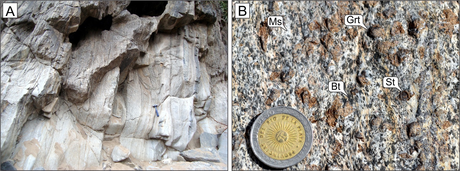 El análisis de las condiciones metamórficas realizado en este trabajo se llevó a cabo en esquistos estaurolíticos de la Unidad tectónica El Indio ubicados en la quebrada de Nikizanga (Fig. 2). Tal como se expone en esta sección y en la siguiente estas rocas poseen una gran cantidad de información textural, como así también una composición química y mineral que facilitan el modelado de equilibrio de fases. Los esquistos estaurolíticos pertenecen a la SMDC y afloran esporádicamente en niveles de unos 5 m de espesor, intercalados con esquistos con muscovita y granate, y esquistos con granate, muscovita y anfíbol (Fig. 3). La alternancia de niveles de diferentes composiciones, representa el registro relíctico de la estratificación (S0). Esta superficie ha sido sobreimpresa por una foliación (S1) registrada dentro y fuera de los porfiroblastos (ver abajo), la cual representa la foliación principal de la unidad, con una orientación aproximada NNE-SSO en el sector suroriental de la sierra.