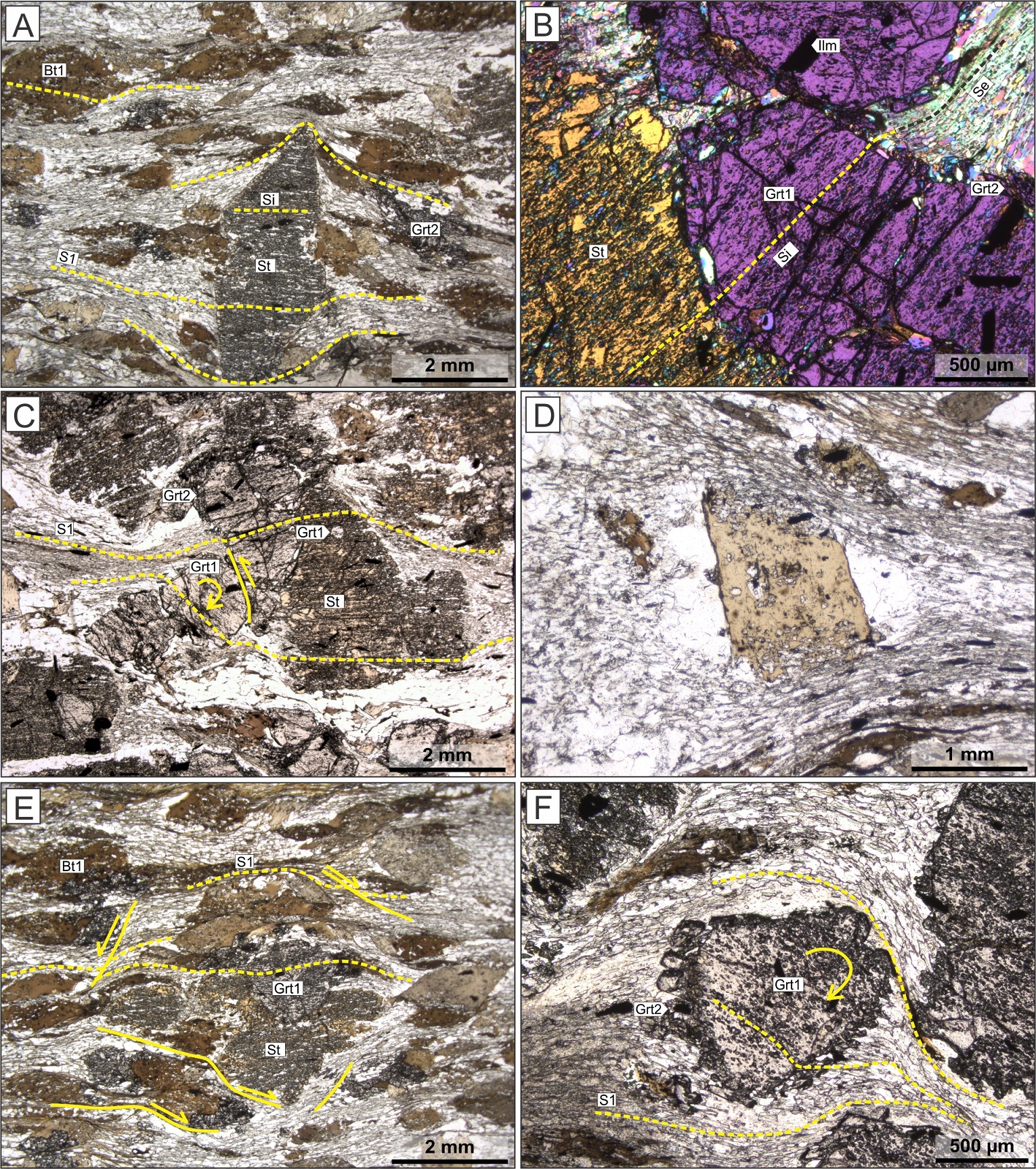 Las estaurolitas (St) forman poiquiloblastos euhedrales que pueden alcanzar los 10 mm de largo y suelen encontrarse en contacto con el Grt1, mostrando una continuidad de la foliación interna al pasar de un mineral al otro (Figs. 4A y B). Se encuentra parcialmente reemplazada en los bordes por muscovita. Por otra parte, la biotita (Bt) se presenta en dos variedades texturales: las Bt1 corresponden a los poiquiliblastos de ca. 1-2 mm con inclusiones alineadas en forma rectilínea (Si) que se continúan con la foliación externa (Fig. 4A). Las Bt2 miden aproximadamente 0,5 mm de largo y se encuentran orientadas según Se, ubicándose mayormente en bordes de los poiquiloblastos de Bt1.