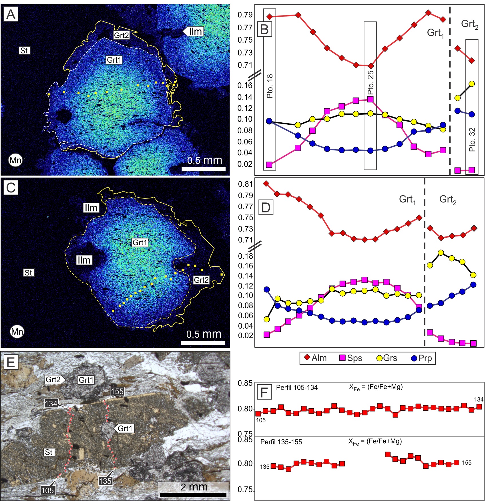 El granate (Grt) registra dos variedades texturales. El Grt1, el más abundante, presenta el patrón orientado ya mencionado de inclusiones rectilíneas de cuarzo (<55 mm) acompañadas de escasas inclusiones de cristales subhedrales de ilmenita. Tiene formas subhedrales y tamaño de ca. 2 mm. El Grt2 aparece como bordes de sobrecrecimientos en el Grt1 o como pequeños cristales individuales en la matriz (Fig. 4A-C). Tiene formas anhedrales a localmente subhedrales, con dimensiones menores a 0,2 mm, como recrecimiento, y tamaños <1 mm en los granos individuales. Presenta inclusiones aciculares de rutilo e ilmenita, además de cuarzo con dimensiones superiores a las registradas en el Grt1 (ca. 100 mm), similares al tamaño de grano de la matriz, las cuales definen trayectorias curvas. El contacto entre los granates Grt2 y Grt1 suele ser irregular, presentando en algunos sectores límites engolfados, lo que indicaría que el Grt1 es parcialmente reabsorbido previo o durante el crecimiento del Grt2.
