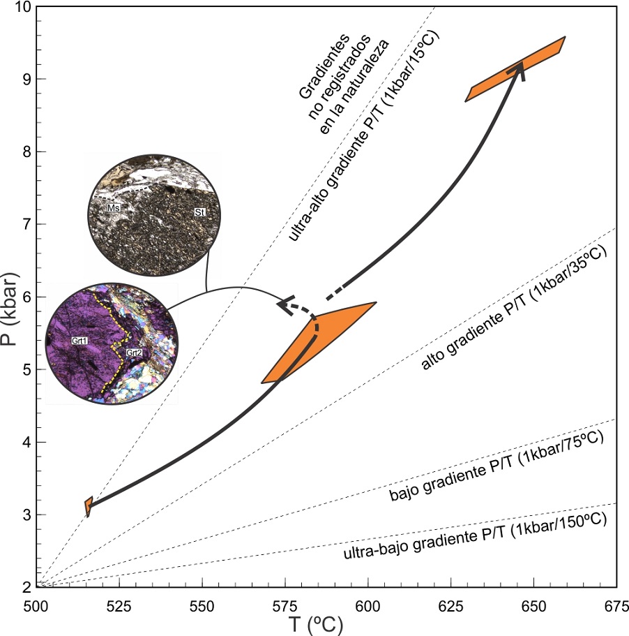 Para estimar las condiciones de equilibrio de esta etapa se utilizan las isopletas calculadas para la composición de Grt2, las cuales se intersectan en el campo con Grt+Bt+Ms+Pl+Qz+H2O y arrojan valores de 9,2±0,5 kbar y 642±17 ºC.