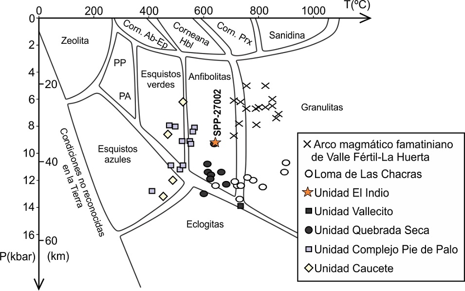 En la figura 11 se muestra un diagrama P-T con las facies metamórficas en el cual se han proyectado todas las muestras de la SPP de las cuales se conocen las condiciones termobarométricas, además de las rocas de Loma de Las Chacras y la caja metamórfica del arco magmático famatiniano de la Sierra de Valle Fértil-La Huerta (Fig. 1). Las rocas de la SPP, se han subdividido en varias unidades separadas por contactos tectónicos basadas en los trabajos de Casquet et al. (2001), Mulcahy et al. (2011) y Ramacciotti (2016). La mayoría de ellas corresponden a condiciones P-T en facies de esquistos verdes y anfibolitas, dos cercanas a las facies de eclogitas, y tres en facies de esquistos azules, a pesar de que no se han encontrado aún esquistos azules ni eclogitas en SPP probablemente debido a causas composicionales (van Staal et al., 2011). Las rocas de Loma de Las Chacras alcanzan las facies de granulitas, con presiones similares a las de la SPP, pero con temperaturas que llegan a los ca. 900 ºC. Por otra parte, la caja del arco magmático de Valle Fértil-La Huerta se encuentra mayormente en facies de granulitas, pero con presiones menores (mayoritariamente entre 6-8 kbar) a las encontradas en el antearco (mayoritariamente entre 8 y 14 kbar).