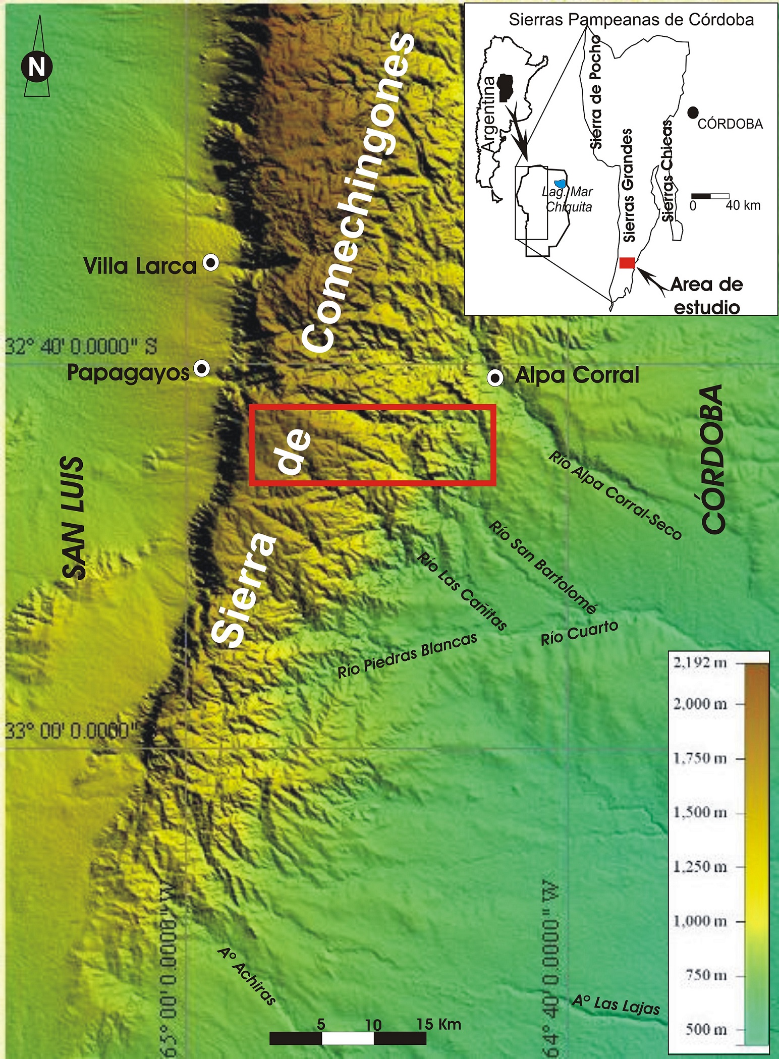 Fig. 1. Modelo de elevación digital del SRTM (Shuttle Radar Topography Mission), 90 m de resolución, del sector sur de la Sierra de Comechingones y localización del área de estudio (rectángulo rojo).