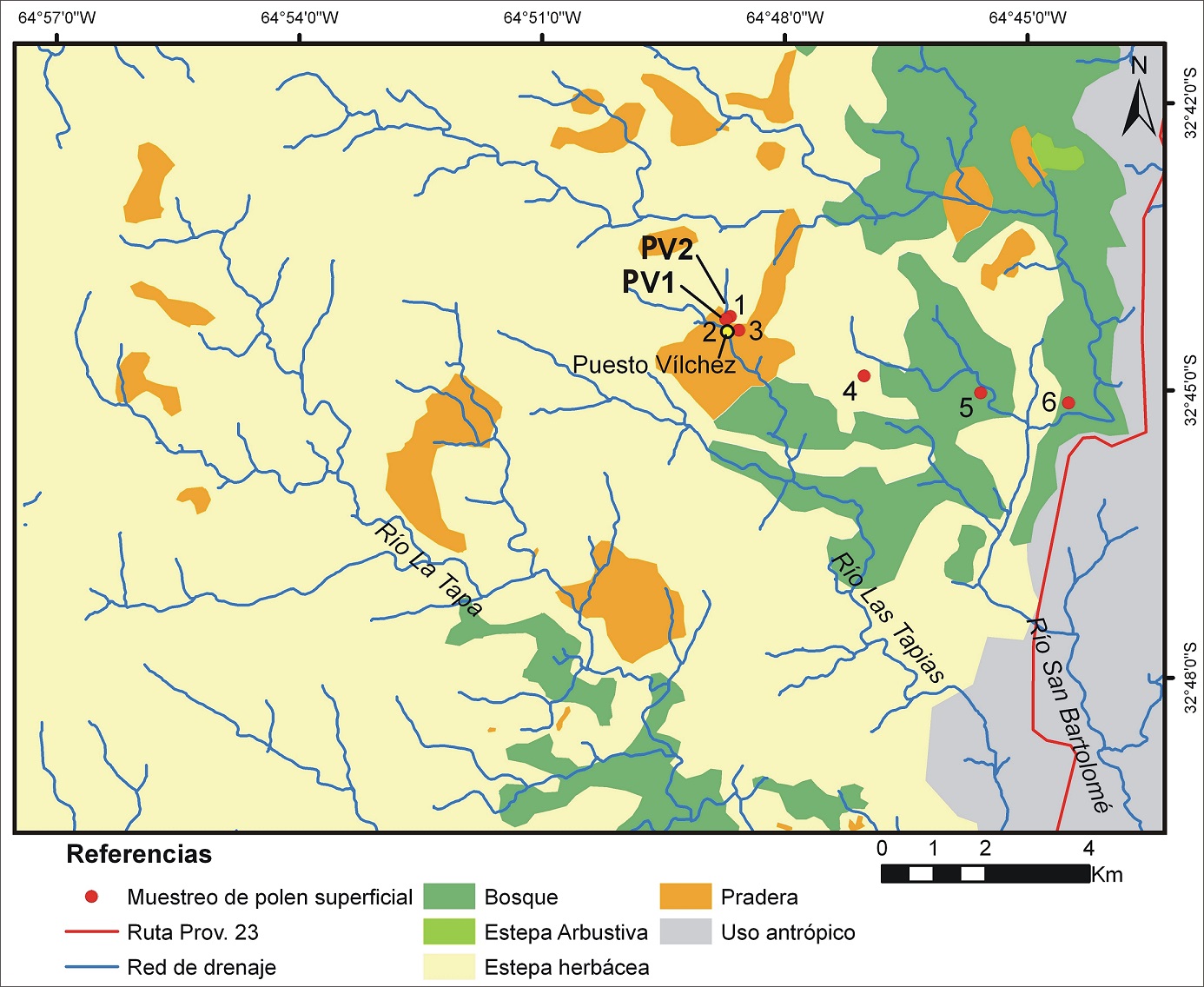 La realización del presente trabajo incluyó estudios geomorfológicos, sedimentológicos y paleoambientales. El trabajo de campo incluyó un análisis morfológico del paisaje, la observación y relevamiento de procesos geomorfológicos activos, el muestreo de muestras polínicas de superficie y la descripción y muestreo sedimentológico, polínico y de diatomeas. Los depósitos de mallines fueron muestreados en sucesiones expuestas por la incisión de arroyos donde se realizaron descripciones sedimentológicas y se recolectaron muestras para estudios sedimentológicos y paleoambientales. La utilización de muestreadores tipo vibracoring y ruso para la extracción de testigos de los mallines activos no fue posible debido a que estos depósitos tienen intercalaciones de granulometría gravosas que imposibilitaron la penetración del instrumental. En esta primera etapa se seleccionaron, en el ambiente granítico, dos sucesiones expuestas representativas del área en inmediaciones del Puesto Vílchez (PV1 y PV2; Fig. 3).