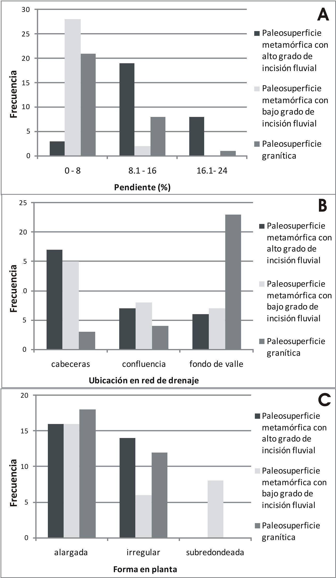 Fig. 7. Gráfico de frecuencias de: rango de pendientes (A), posiciones en la red de drenaje (B), y forma en planta de los mallines (C) en las tres unidades geomorfológicas.