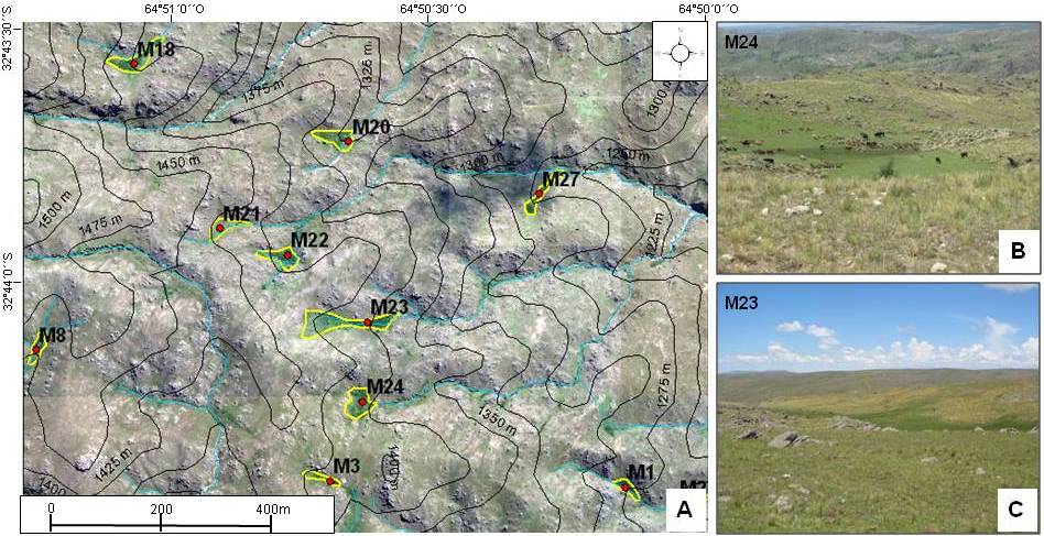 Fig. 9. A. Detalle de un sector de la paleosuperficie metamórfica con alto grado de incisión fluvial (imagen satelital Bing). Con contornos amarillos se indican las áreas ocupadas por mallines y en líneas negras las curvas de nivel, con equidistancia de 25 m. B. Vista del mallín M24. C. Vista del mallín M23 (Ubicación en figura 4).