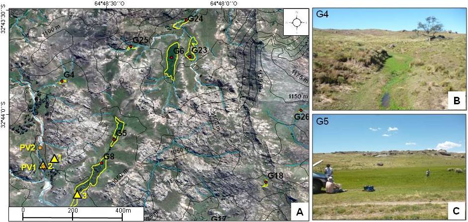 Fig. 10. A. Detalle de un sector de la paleosuperficie granítica (imagen satelital Bing). Con contornos amarillos se indican las áreas ocupadas por mallines, y en líneas negras las curvas de nivel, con equidistancia de 25 m. Se ubican también los perfiles sedimentológicos PV1 y PV2 (círculos naranjas) y las muestras polínicas superficiales (triángulos amarillos). B. Vista del mallín G4, ubicado en el eje de una cárcava. C. Vista del mallín G5 (Ubicación de mallines en figura 4).