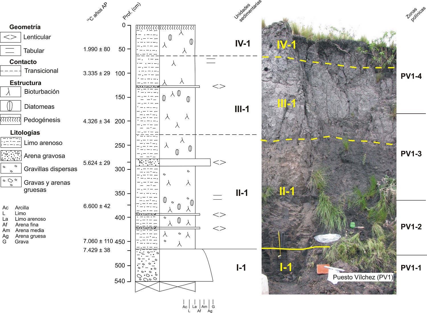 En las secciones PV1 y PV2 se determinó textura, color (Tabla de Color de Munsell), estructuras sedimentarias, grado de compactación, grado de bioturbación, tipo de contactos entre las unidades sedimentarias. En el laboratorio las muestras de sedimentos se secaron a temperatura ambiente y, posteriormente, se desagregaron mecánica y químicamente. La distribución por tamaño de partícula se obtuvo utilizando un contador láser de partículas Malvern (modelo Mastersizer Hydro 2000); luego se clasificó según la propuesta de Folk et al. (1970) y se procesaron estadísticamente según Folk y Ward (1957). Se determinó el contenido de carbono orgánico total (COT) por pérdida por ignición (Heiri et al., 2001), utilizando 7 g de muestra tamizada a 2 mm.