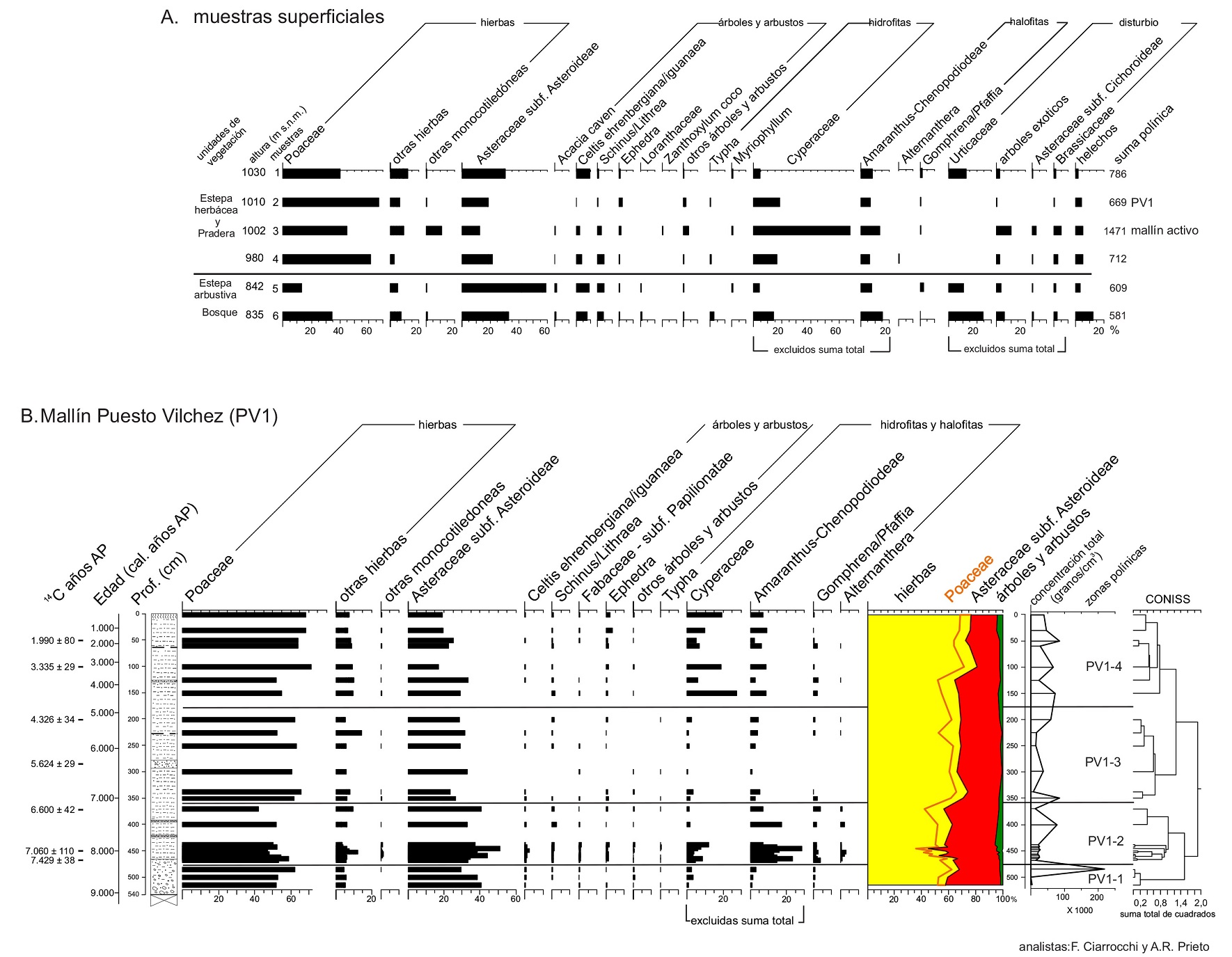 Para la identificación del polen y las esporas se utilizó la colección de referencia del Laboratorio de Paleoecología y Palinología de la Universidad Nacional de Mar del Plata y atlas y claves publicadas (Heusser, 1971; Markgraf y D’Antoni, 1978). Debido a la baja resolución taxonómica del polen de Asteraceae, fueron agrupados como Asteraceae subf. Asteroideae (incluye hierbas y arbustos) y Asteraceae subf. Cichoroideae. Otras “monocotiledóneas” incluye a varias especies de Iridaceae, Amaryllidaceae y Bromeliaceae (hierbas y epífitas). Cada taxón se expresó en porcentaje de la suma total de polen, de la cual fueron excluidos los tipos polínicos extra-regionales e indeterminados. En las muestras superficiales se excluyeron los tipos exóticos o que indican disturbio y Urticaceae por estar sobrerrepresentada. Cyperaceae y Amaranthus-Chenopodioideae fueron excluidas en las muestras actuales y fósiles porque representan situaciones locales relacionadas con las condiciones edáficas. Para obtener una buena representación de los taxones que tienen polinización entomófila como la mayoría de los árboles y arbustos, se contaron al menos 200 granos de polen, excluyendo a Poaceae y Cyperaceae en las muestras actuales de los pastizales y en las fósiles. Las sumas polínicas fósiles varían entre 560 y 1.082 granos. Los diagramas polínicos y la zonación del perfil polínico PV1 se realizaron con el programa Tilia versión 2.0.4 (Grimm, 2004).
