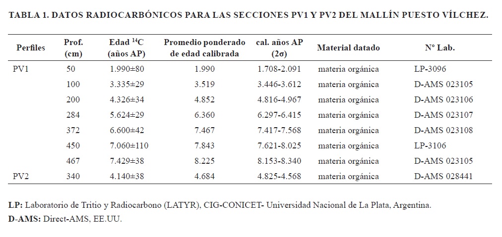 Dos dataciones radiocarbónicas convencionales y seis AMS, determinadas sobre sedimentos ricos en materia orgánica (Tabla 1) proporcionaron el control cronológico para las sucesiones PV1 y PV2 del mallín Puesto Vílchez. Las dataciones radiocarbónicas fueron calibradas con la curva del hemisferio sur, SHCal13 (Hogg et al., 2013) utilizando el programa Calib Rev. 7.1.0 (Stuiver et al., 2018). El modelo de edad-profundidad para el perfil PV1 fue construido con el programa Tilia versión 2.0.4 (Grimm, 2004).