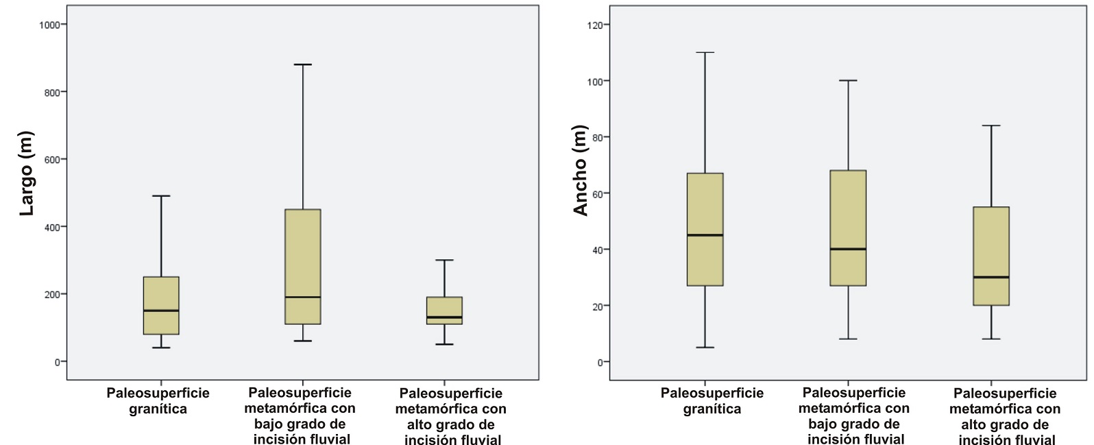 En la Paleosuperficie desarrollada sobre rocas graníticas el 85% de los mallines se localizan en la facies interna del plutón Alpa Corral, dominando aquellos que geomorfológicamente ocupan los fondos de valles o áreas deprimidas o depresiones donde conforman pequeñas llanuras dentro de este ambiente (Figs. 4A y C, 7B y 10A y C, e.g., G5, G6 y G8). Tienen formas elongadas, con ancho variable a lo largo del eje del mallín, o bien formas irregulares (Fig. 7C). Las dimensiones promedio son de 190 m de largo y 47 m de ancho (Fig. 6), y las pendientes varían entre 4 y 8% (Fig. 7A). El 15% restante se localiza en la facies externa del plutón (e.g., G18, G19, G26, Figs. 5 y 10A), en este caso ocupando posiciones de cabeceras de los cursos de menor orden, con dimensiones menores (promedios: 89 m de largo y 28 m de ancho), y pendientes entre el 7,4 y 17%.