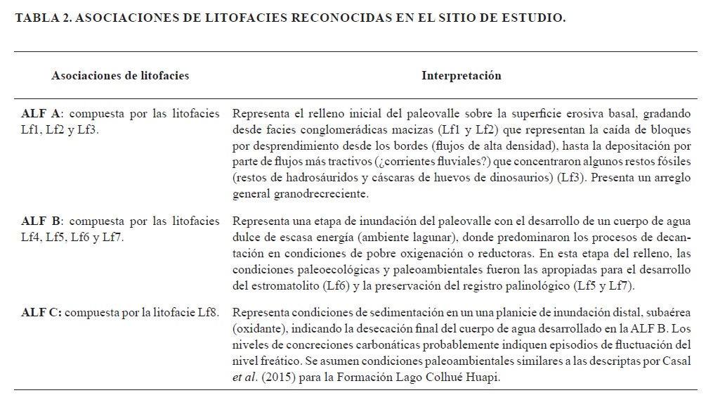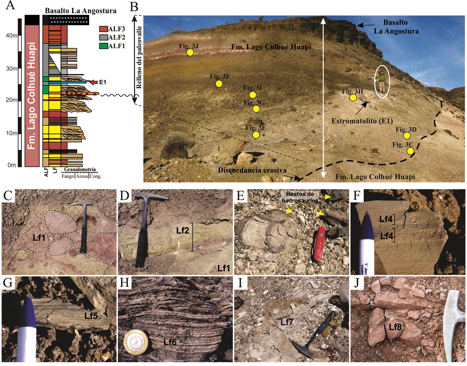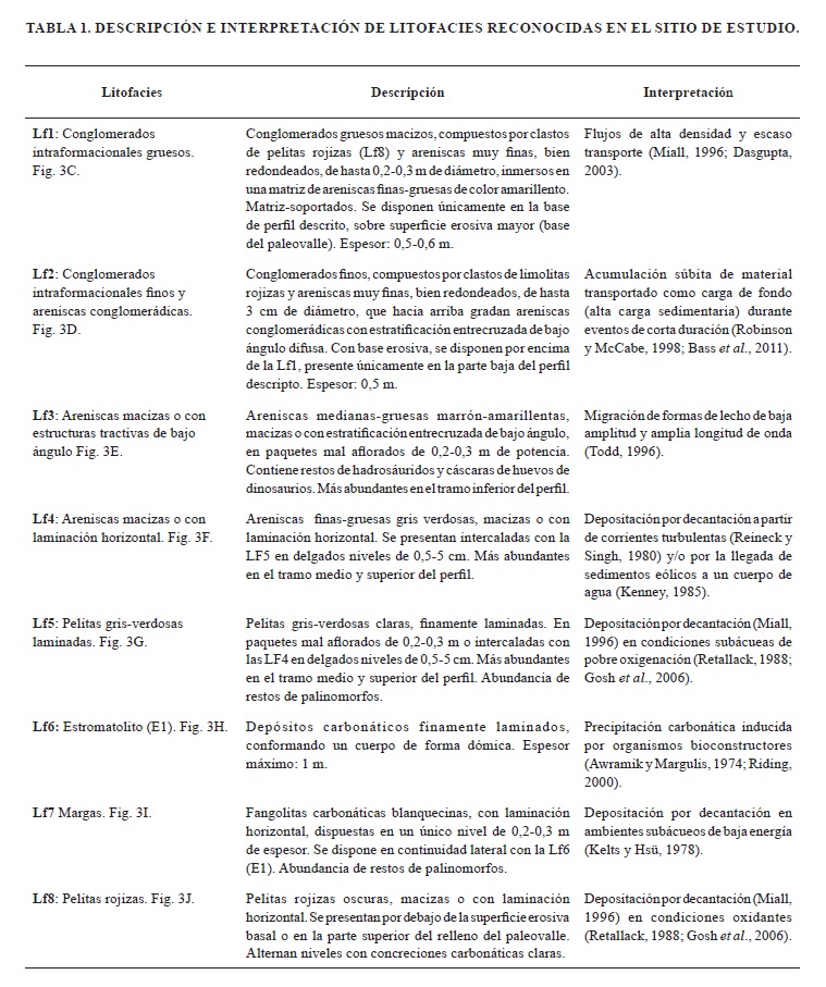 La sucesión sedimentaria comienza con un relleno basal integrado por un conglomerado intraformacional grueso, macizo y con intraclastos de limolitas rojas y areniscas de hasta 0,3 m de diámetro (Lf1, Tabla 1), continúan conglomerados finos con estratificación entrecruzada de bajo ángulo y difusa (Lf2, Tabla 1) y areniscas gruesas a medianas con estratificación entrecruzada de bajo ángulo, de color ocre y negro portadoras de restos de hadrosáuridos (UNPSJB-PV 1050) y cáscaras de huevos de dinosaurios (Lf3, Tabla 1). Por encima se presentan arcilitas laminadas o macizas de coloración oscura de 0,30 cm de potencia y con abundantes palinomorfos (Lf5, Tabla 1), seguidas de un nivel de margas blancas con laminación horizontal, de 0,20 m de potencia (Lf7, Tabla 1) y que lateralmente se relaciona con el estromatolito E1 (Lf6, Tabla 1). Este nivel de margas blancas incluye una asociación palinológica con granos de polen bi y trisacados como elementos dominantes que se encuentran en estudio. Más arriba se disponen en alternancia areniscas verde-amarillentas (Lf4, Tabla 1) y arcilitas gris-verdosas (Lf5), seguidas nuevamente por las arcilitas rojas típicas de la unidad con la intercalación de niveles de concreciones carbonáticas blancas (Lf8, Tabla 1). El perfil culmina con el basalto La Angostura (Fig. 3A-B) que ha sido datado mediante el método 40Ar/39Ar en masa fundamental en 67.31±0.55 Ma y asignado al Maastrichtiano tardío (Clyde et al., 2014).