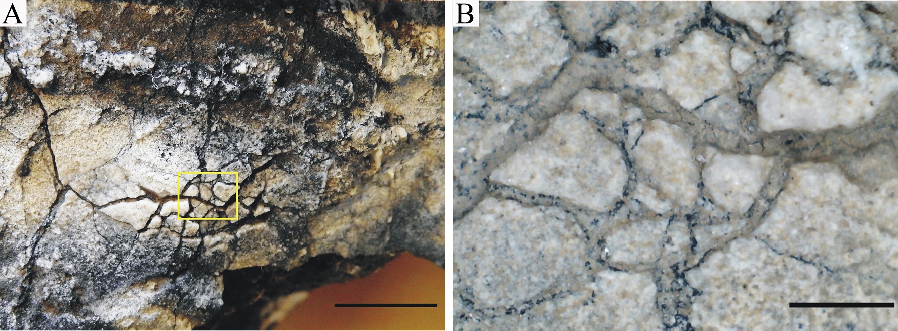La presencia de grietas poligonales e irregulares en el techo del E1 (Fig. 6) es interpretada aquí como grietas de desecación producto de la somerización del cuerpo de agua y la exposición subaérea con la consecuente desecación de la superficie del estromatolito. Estos polígonos de desecación de variado tamaño y diseño serían el resultado de la deshidratación de los tapices microbianos y algales y podrían representar el principal rasgo sedimentario de destrucción de los mismos (Sanz-Montero et al., 2012).