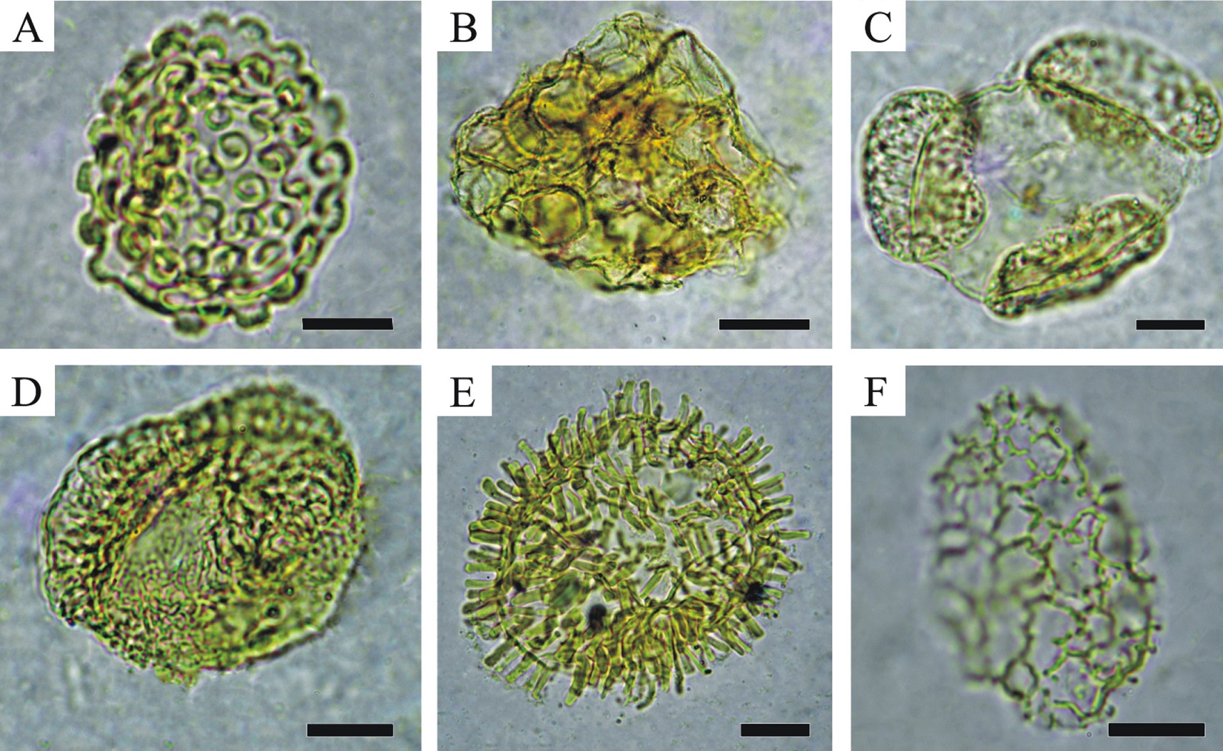 Posteriormente, se produjo la inundación del paleovalle con el desarrollo de un cuerpo de agua de escasa energía, determinando un ambiente lagunar (ALF B, Tabla 2), donde predominaron los procesos de decantación. Las palinofloras procedentes de estos niveles pelíticos ubicados por encima del relleno basal del paleovalle e inmediatamente por debajo del estromatolito E1 y también en las margas blancas asociadas lateralmente al mismo, están dominadas por granos sacados de Podocarpaceas (Fig. 9C-D) e incluyen la presencia de palinomorfos indicadores de un cuerpo de agua dulce somero, de poca energía y aguas limpias (Vallati et al., 2016). Entre ellos, se menciona la presencia de zigosporas de Zygnemataceae y estructuras reproductivas de helechos acuáticos (Fig. 9B). En particular, Catinipollis geiseltalensis Krutzsch, 1966 (Fig. 9A) y Ovoidites sp., que son esporas de algas verdes filamentosas (Zygnemataceae), podrían haber formado localmente parte de los tapetes microbianos y algales del estromatolito E1. Además, como se mencionó anteriormente, se han estudiado secciones delgadas correspondientes al E1 en el microscopio petrográfico, en donde se reconocieron valvas de ostrácodos articuladas (Fig. 5A) y desarticuladas no fragmentadas (Fig. 5B) que sugieren, al igual que las asociaciones palinológicas, la presencia de aguas tranquilas. Estas condiciones subácueas reductoras se ven modificadas transicionalmente hacia el tope del perfil, donde se restablece un ambiente oxidante en una planicie de inundación subaérea (ALF C, Tabla 2). Por otra parte, la composición de las palinofloras refleja condiciones de clima templado y húmedo en el ambiente de depositación.