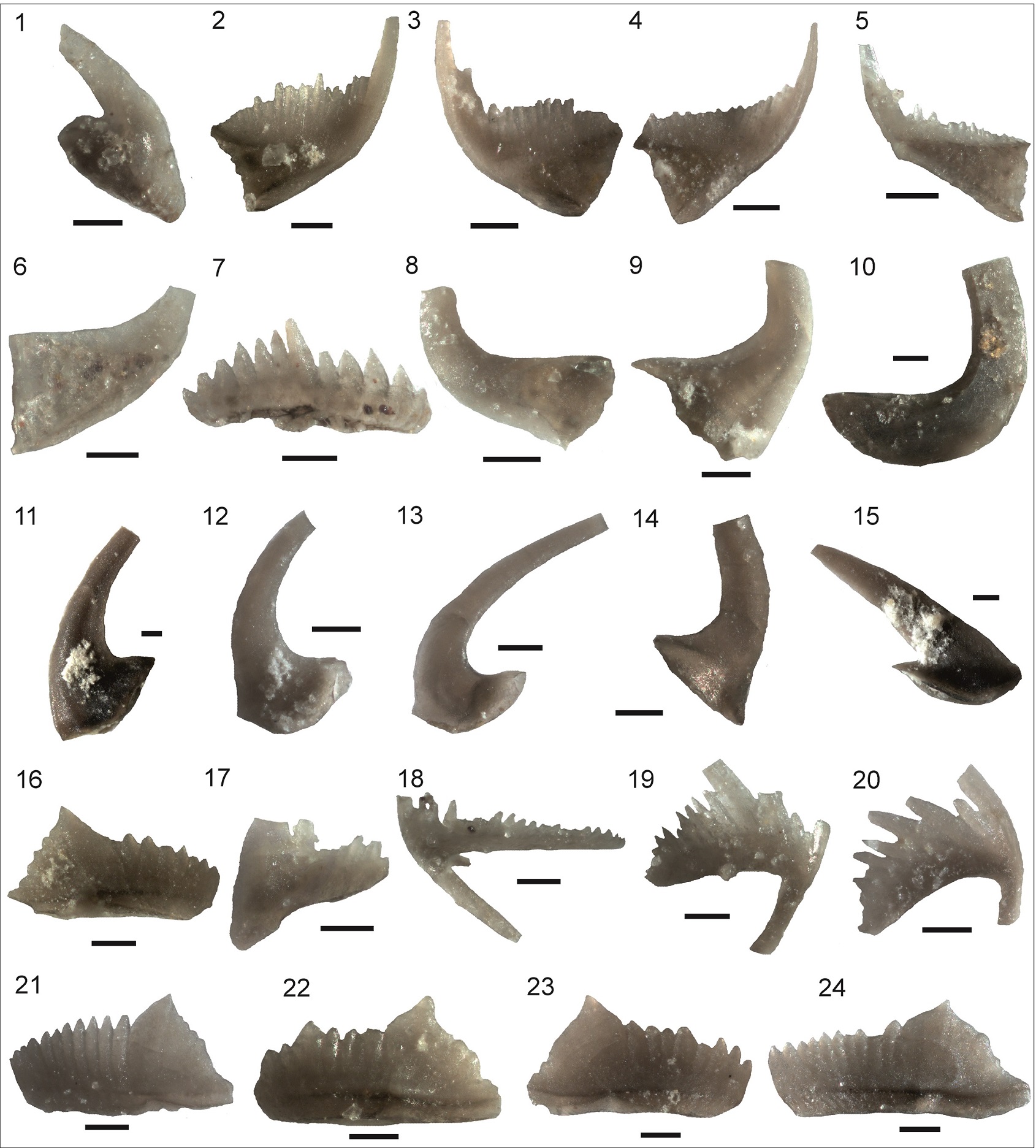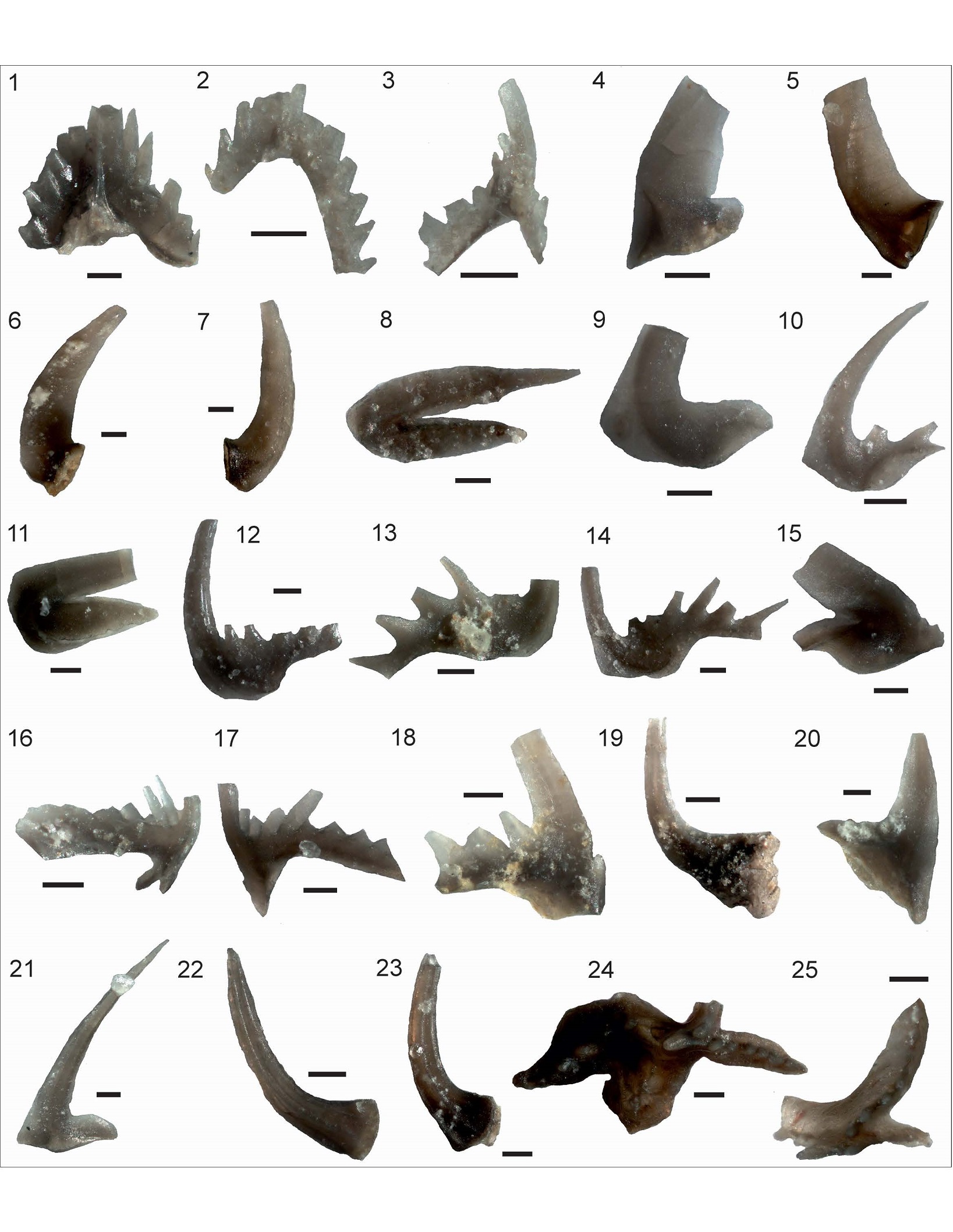 A diverse conodont association was recovered from the study section, including the following species (Figs. 3, 4, 5): Ansella jemtlandica (Löfgren), A. sinuosa (Stouge), Baltoniodus clavatus Stouge and Bagnoli, “Bryantodina” aff. typicalis (Stauffer), Coelocerodontus bicostatus van Wamel, Cornuodus longibasis (Lindström), Costiconus ethingtoni (Fåhræus), Dapsilodus sp., Decoriconus pesequus Löfgren, Drepanoistodus sp. Drepanoistodus bellburnensis Stouge, D. tablepointensis Stouge, Drepanodus arcuatus Pander, D. reclinatus (Lindström), Erraticodon alternans (Hadding), Fahraeusodus jachalensis Feltes and Albanesi, Histiodella serrata Harris, H. sinuosa, H. holodentata, Juanognathus jaanussoni Serpagli, Microzarkodina hagetiana (Stouge and Bagnoli), Parapaltodus simplicissimus Stouge, Paraprioniodus costatus (Mound), Paroistodus horridus Barnes and Poplawski, P. horridus secundus Albanesi, P. originalis (Sergeeva), Periodon macrodentatus, Polonodus sp. Protopanderodus gradatus Serpagli, Pteracontiodus cryptodens (Mound), Rossodus barnesi Albanesi, Scolopodus striatus (Lindström), and Semiacontiodus potrerillensis Albanesi and Yangtzeplacognathus crassus (Chen and Zhang).