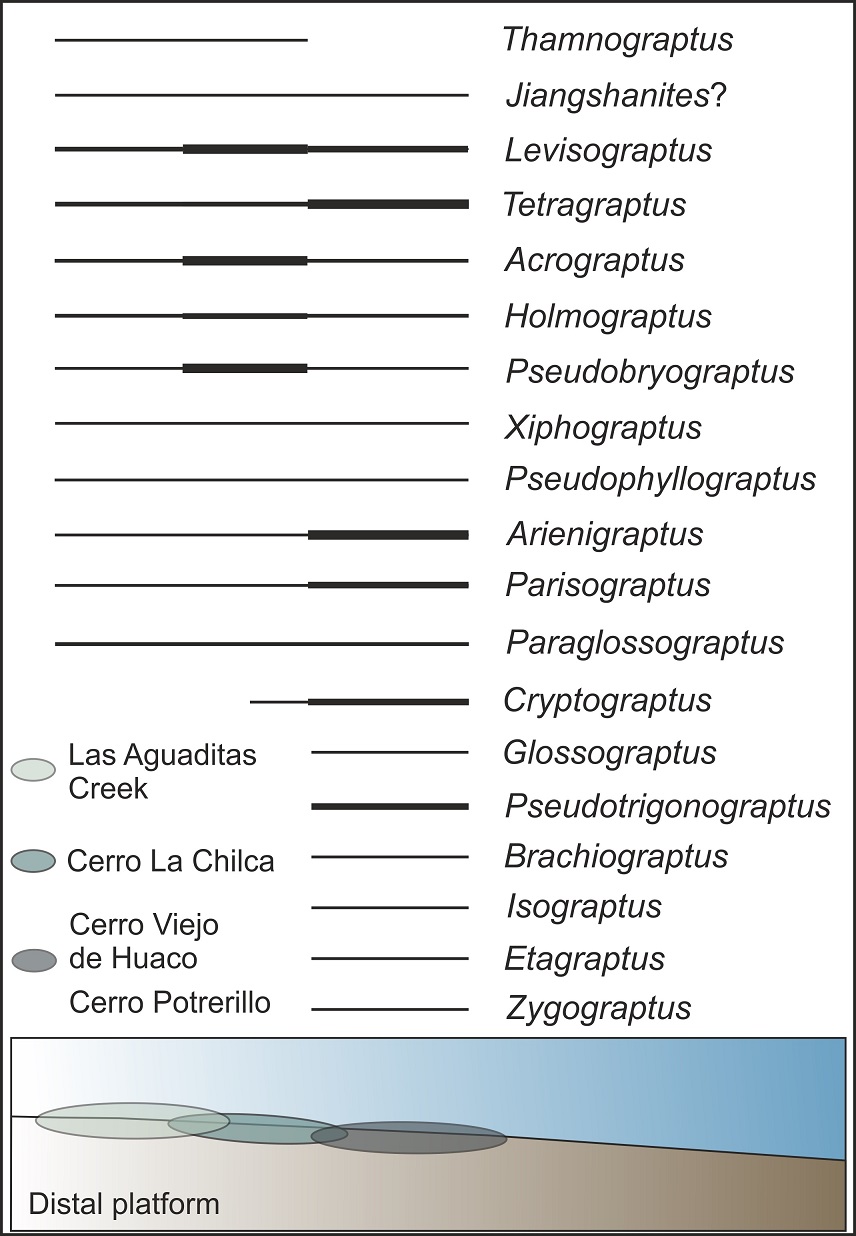 FIG. 8. Scheme showing the distribution of the graptolite genera documented along the distal platform in different areas from the Central Precordillera (Cerro Potrerillo, Oculta Creek, Cerro Viejo de Huaco, Las Aguaditas Creek and Cerro La Chilca sections). Thickness of lines represents the relative abundance of the genera. Figure adapted from Boucot and Chen (2009).