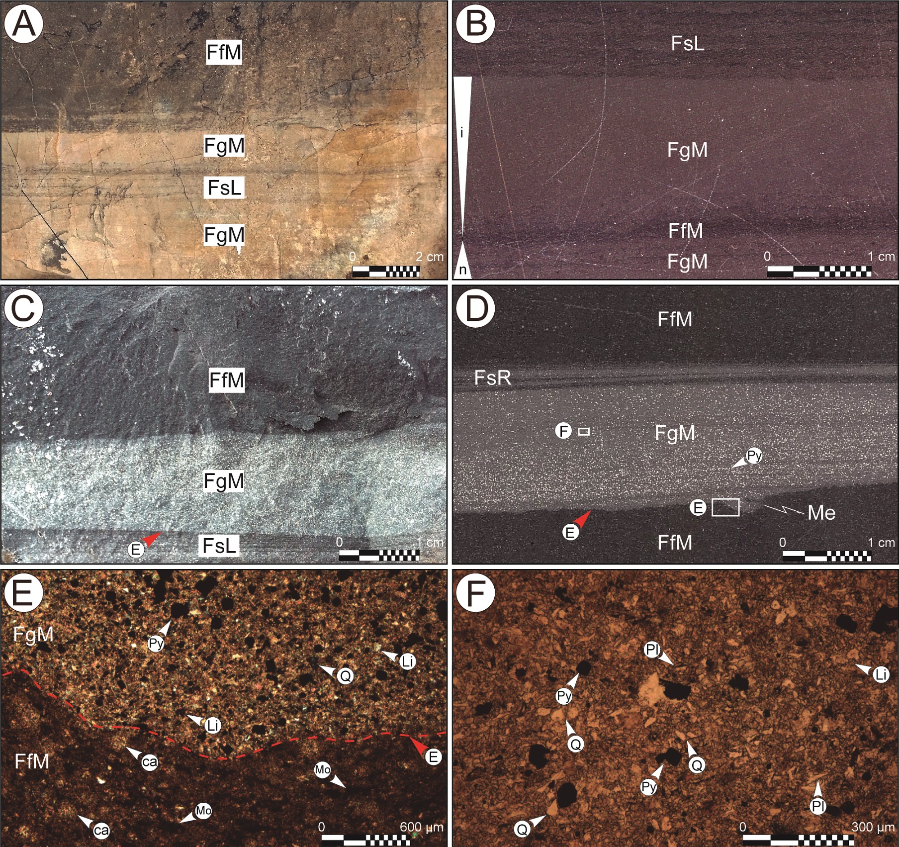 La facies FgM está integrada por fangolitas gruesas macizas silíceas. Suele disponerse en forma transicional (Fig. 6A y B) sobre facies de fangolitas finas macizas (FfM) o eventualmente facies laminadas (FsL), o bien define bases netas/erosivas (E, Fig. 6C, D y E). Como puede observarse en el corte pulido de la muestra AM-01 (Fig. 6D), cuando la facies FgM define bases erosivas, es común encontrar marcas de erosión (Me, Fig. 6D y E) u ocasionalmente estructuras de deformación asociadas, entre las que se reconocen estructuras en llamarada (flame) y laminación convoluta.