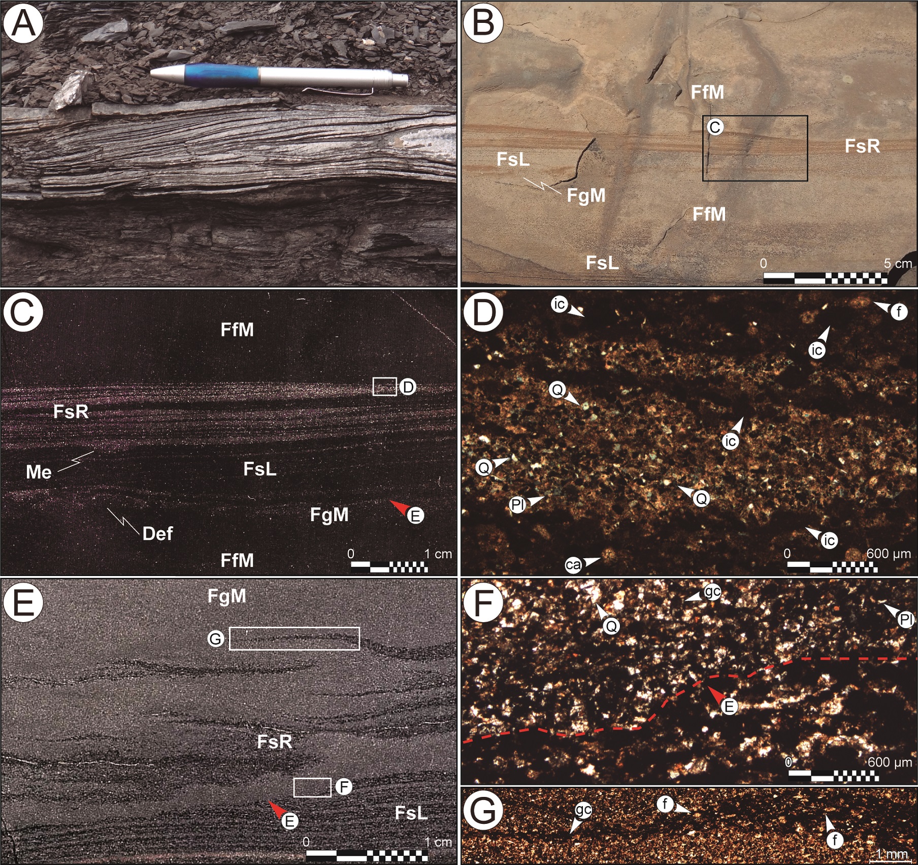 La facies FsR se compone de fangolitasarenosas a gruesas con ondulas de fango (Fig. 7A). La laminación ondulítica es asimétrica y está representada por láminas de sotavento de bajo ángulo (Fig. 7A, B, C y D), con excepciones menores donde se preservan las caras de barlovento (Fig. 7E). Esta facies suele disponerse en base erosiva (Fig. 7E y F), a veces con marcas de erosión y estructuras de deformación asociadas (Fig. 7C). En cuanto a su composición, las láminas de sotavento pueden estar integradas por clastos de cuarzo y plagioclasa tamaño fango grueso a arena muy fina (Fig. 7D) o eventualmente por granos compuestos (gc) que consisten en agregados arcillosos tamaño arena muy fina a fina (Fig. 7F y G). El término granos compuestos se emplea en el sentido de Lazar et al. (2015b) para aquellos casos donde no es posible discriminar petrográficamente el origen de los agregados de arcilla.