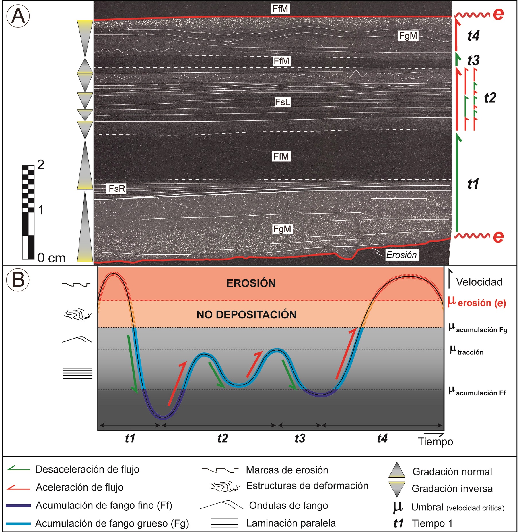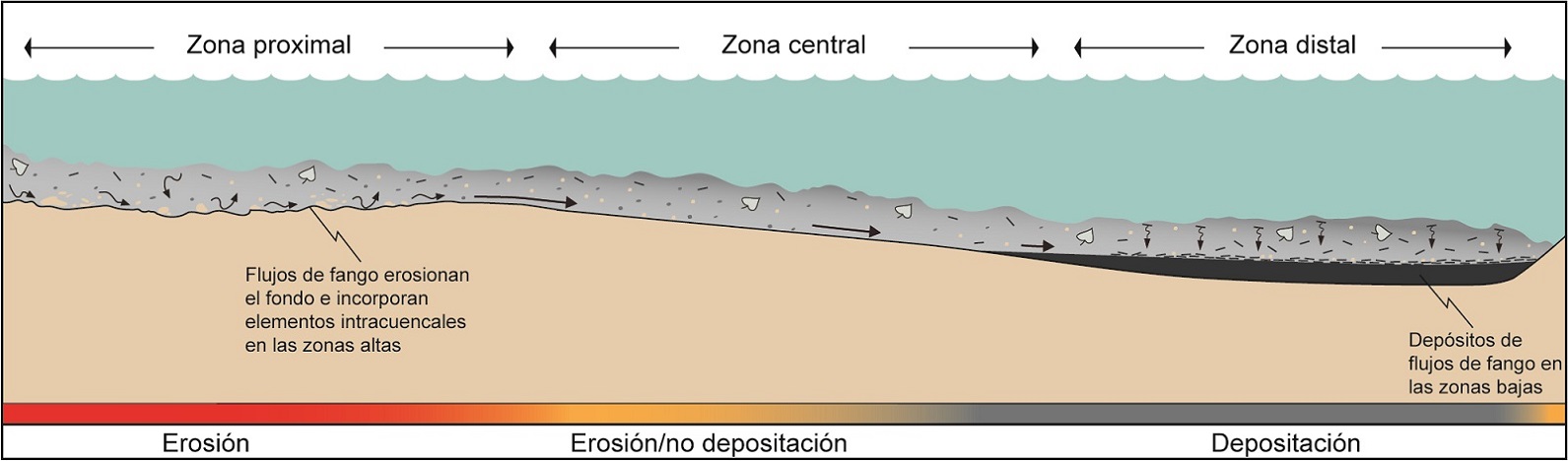 Los depósitos de flujos de fango a menudo se disponen en capas de fangolitas gradadas de espesor centimétrico separadas por contactos erosivos/netos que definen períodos de erosión/no depositación (Fig. 5). Durante este período se interpreta que la velocidad del flujo se encontraría por encima del umbral crítico para la acumulación de fango grueso (Vf>μFG).