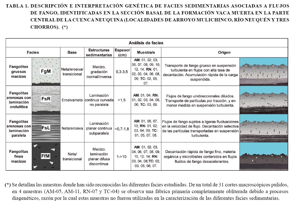 El análisis sedimentológico realizado en 31 cortes pulidos de concreciones carbonáticas permitió reconocer una variedad de depósitos fangolíticos que pueden agruparse básicamente en 4 facies sedimentarias: fangolitas gruesas macizas (FgM), fangolitas arenosas con laminación ondulítica (FsR), fangolitas arenosas con laminación paralela (FsL) y fangolitas finas macizas (FfM). En la tabla 1 se describen las principales características de cada facies, se mencionan los procesos sedimentarios que le habrían dado origen y se indica en qué muestras fueron reconocidas.