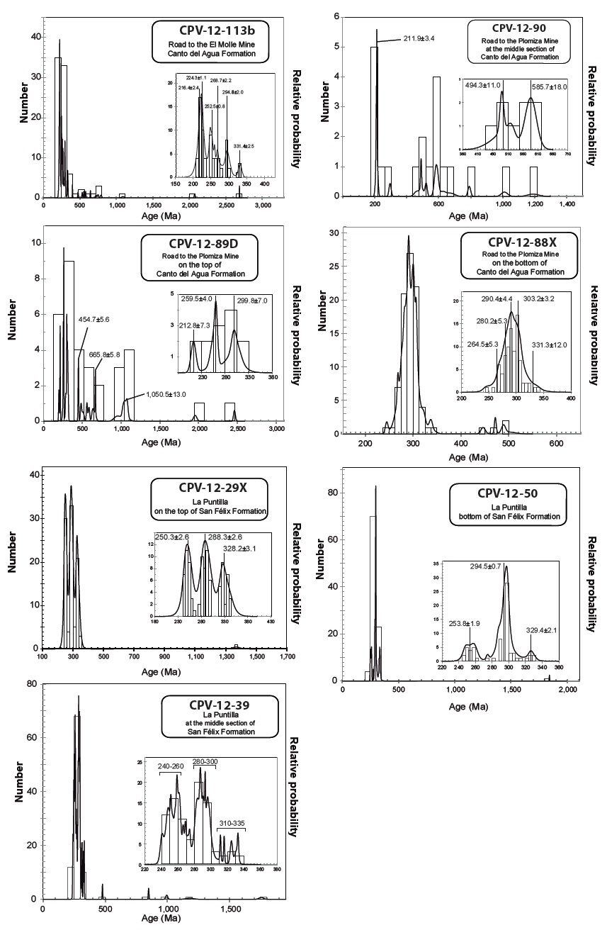 Zircon age distribution (n=20) from an arkose of the middle section (CPV-12-90) show well-defined peaks of 211.9±3.4 Ma, 494.3±11.0 and 585.7±18.0 Ma (Fig. 7). At the top of the type section (CPV-12-89D), the U-Pb age populations (n=33) from an arkose are 212.8±7.3, 259.4±4.0, 299.8±7.0, 454.7±5.6, 665.8±5.8 and 1,050.5±13.0 Ma (Fig. 7). A litharenite from the El Molle mine section (CPV-12-113b) shows well-defined peaks (n=95) at 216.4±2.4 Ma, 224.3±1.1, 252.5±0.8, 268.7±2.2, 294.8±2.0 and 331.4±2.5 Ma (Fig. 7).