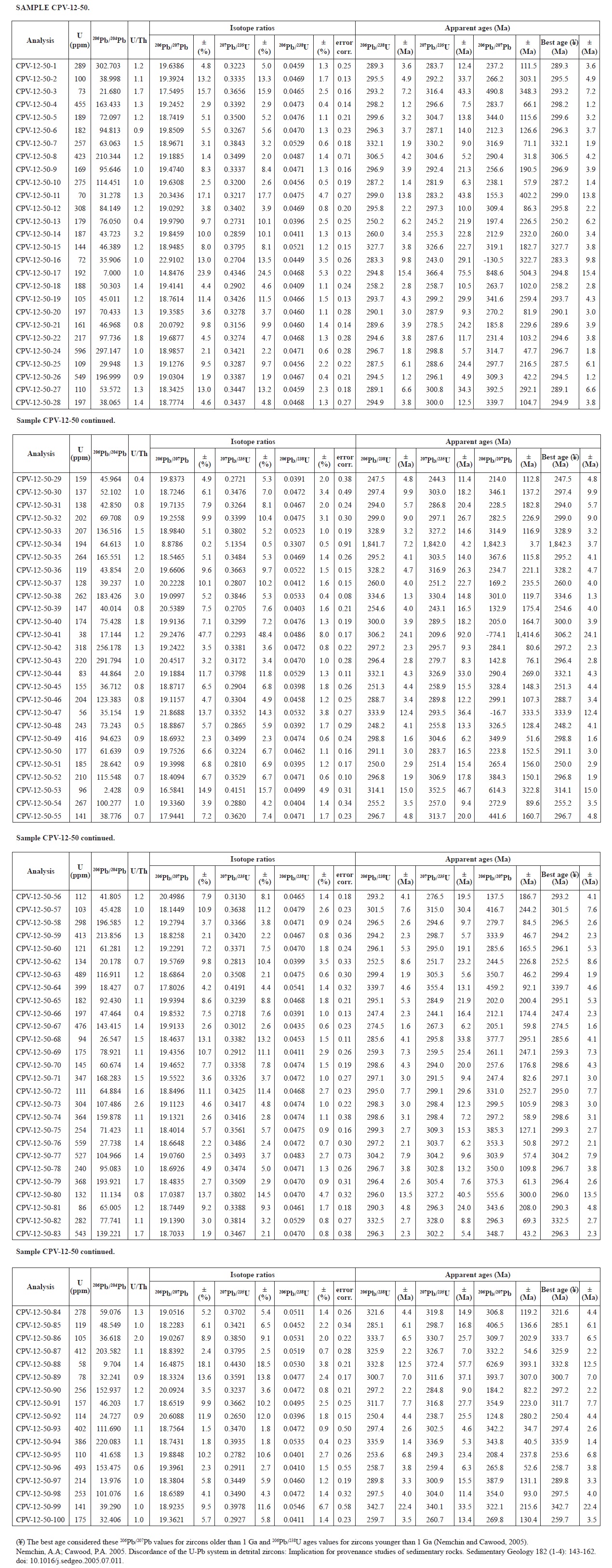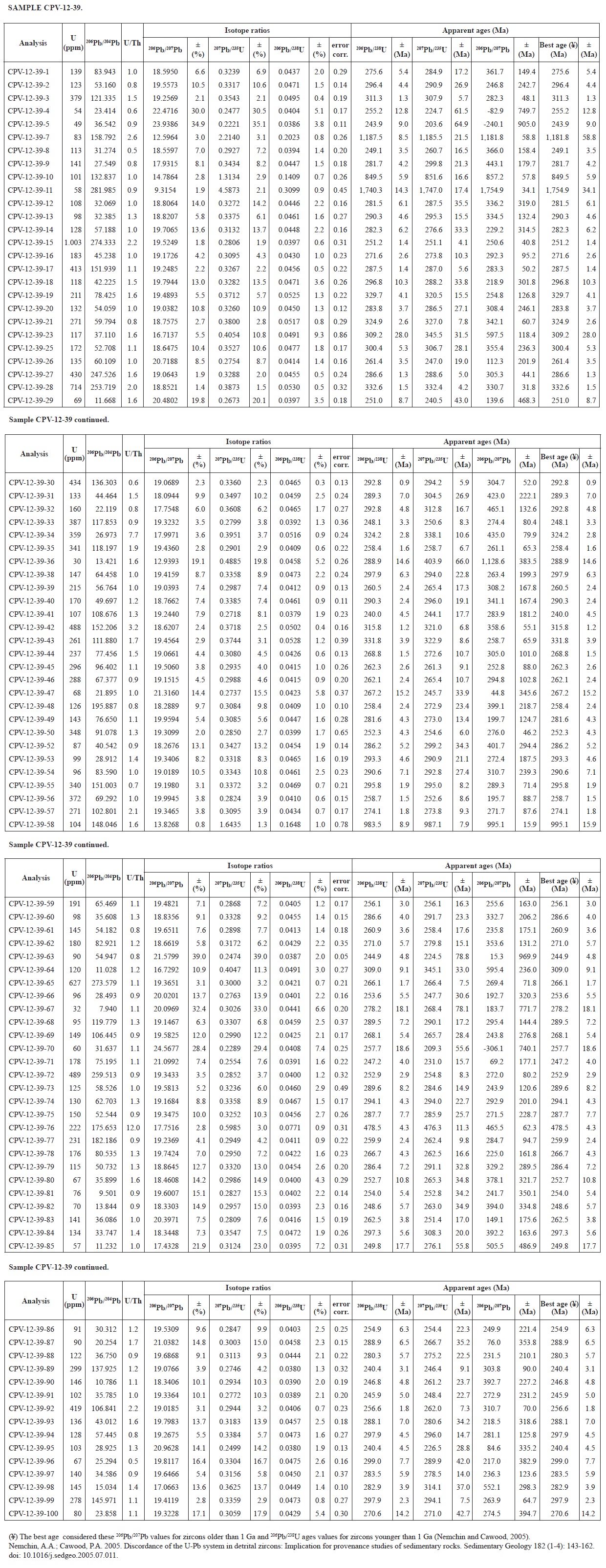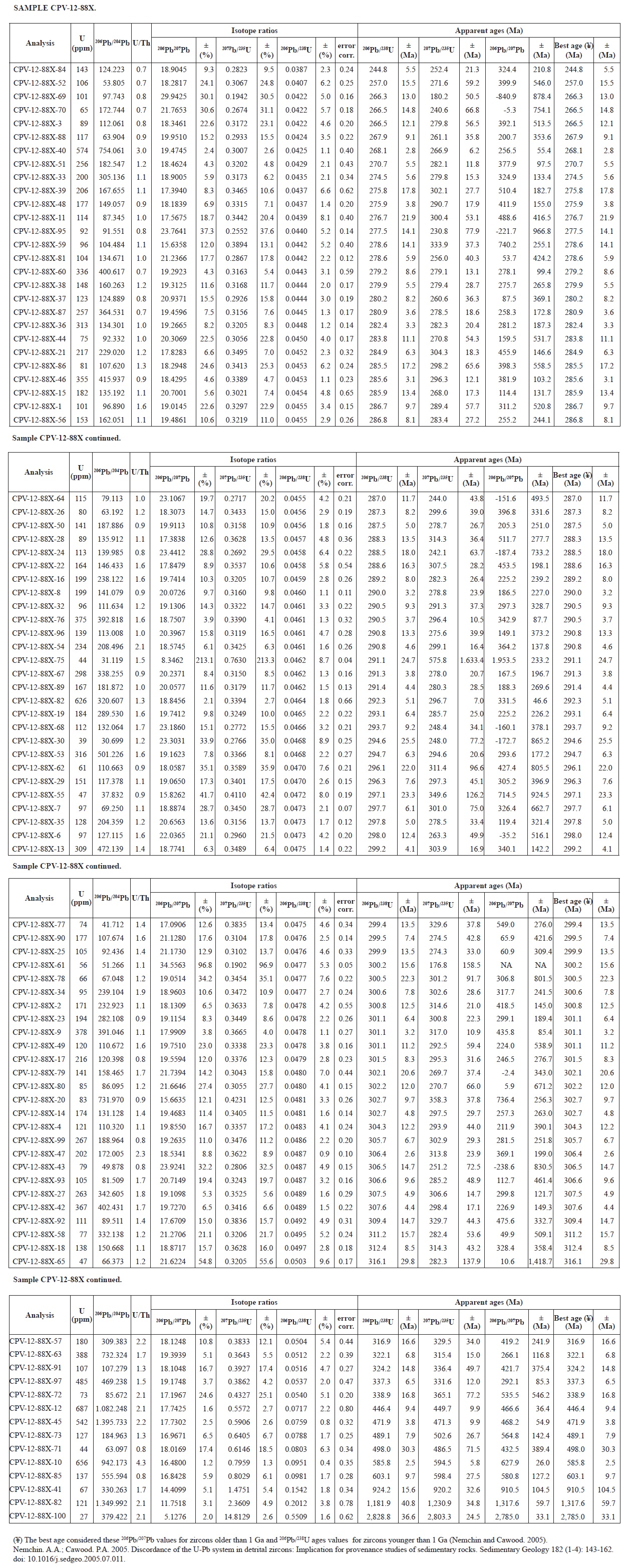 A sandstone from the bottom of the type locality section (CPV-12-88X) yielded five unmixed Permian-Carboniferous age peaks (n=94): 264.5±5.3, 280.2±5.3, 290.4±4.4, 303.2±3.2 and 331.3±12 Ma (Fig. 7), and four dispersed zircons between 450 and 500 Ma.
