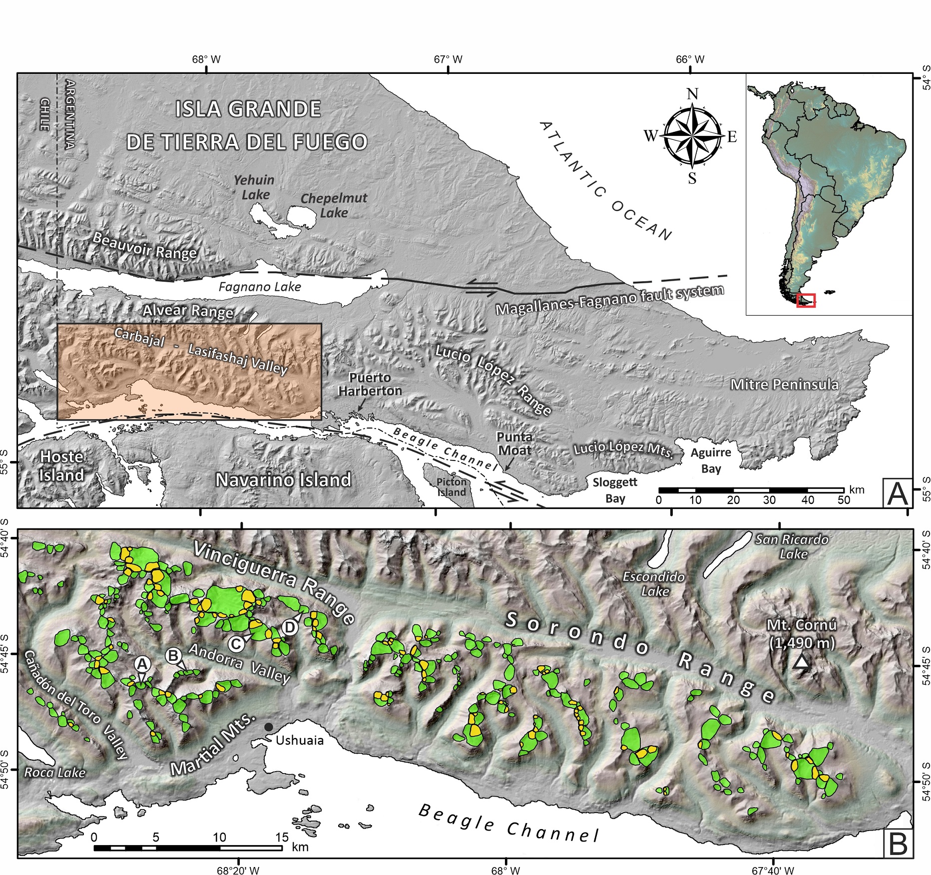 The Fuegian Andes represent the southernmost segment of the Andes Range, including the Fuegian Archipelago and the southern portion of the Isla Grande de Tierra del Fuego, at the southern end of South America (Fig. 1A). At this latitude, the N-S direction of the Andes changes to E-W due to the continuous movement of the Scotia plate eastwards since the Early Tertiary (Rabassa et al., 2005). In Chilean territory, the Fuegian Andes receive the name of Cordillera Darwin, with its maximum altitude at Mount Darwin, 2,440 m above sea level (a.s.l.), comprising mainly the Fuegian Archipelago. On the Argentine side (maximum altitude: Mount Cornú, 1,490 m a.s.l.) the Fuegian Andes extend up to the eastern end of the island, continuing in Isla de los Estados beyond the ~30 km-wide Le Maire Strait. This mountainous section consists of several mountain ranges predominantly oriented WNW-ESE, separated by structural valleys, with maximum elevations descending from W to E from 1,100-1,400 m a.s.l. to ca. 500 m a.s.l.