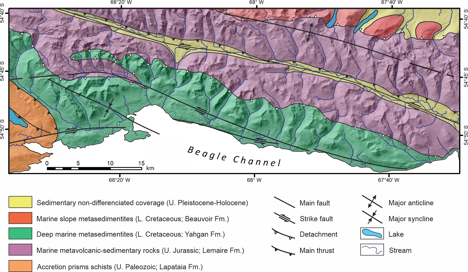 Menichetti, M.; Lodolo, E.; Tassone, A. 2008. Structural geology of the Fuegian Andes and Magallanes fold-and-thrust belt-Tierra del Fuego Island. Geologica Acta 6 (1): 19-42.