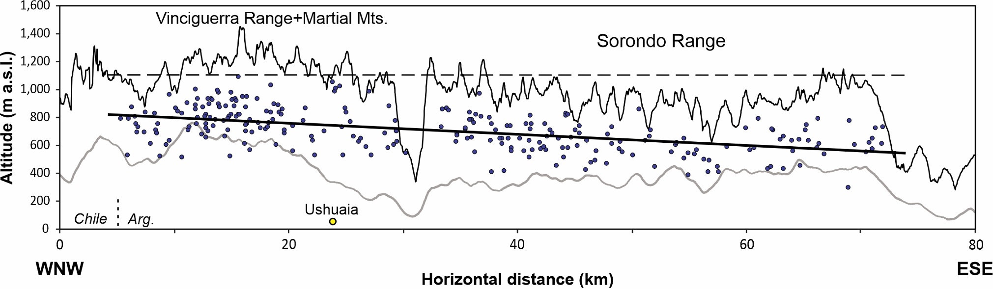 Fig. 3. Swath topographic profile of the study area. The black profile line corresponds to the maximum elevations, and the gray line was confectioned with the mean elevations. Cirques (blue dots) were plotted according their floor altitude, and the black solid trend line built from them constitute an approximation to the composite Quaternary ELA (Flint, 1957; Porter, 1975). The dashed line illustrates the present-day ELA estimated for the area, based on Coronato (1996), Coronato et al. (2009) and Iturraspe (2011).