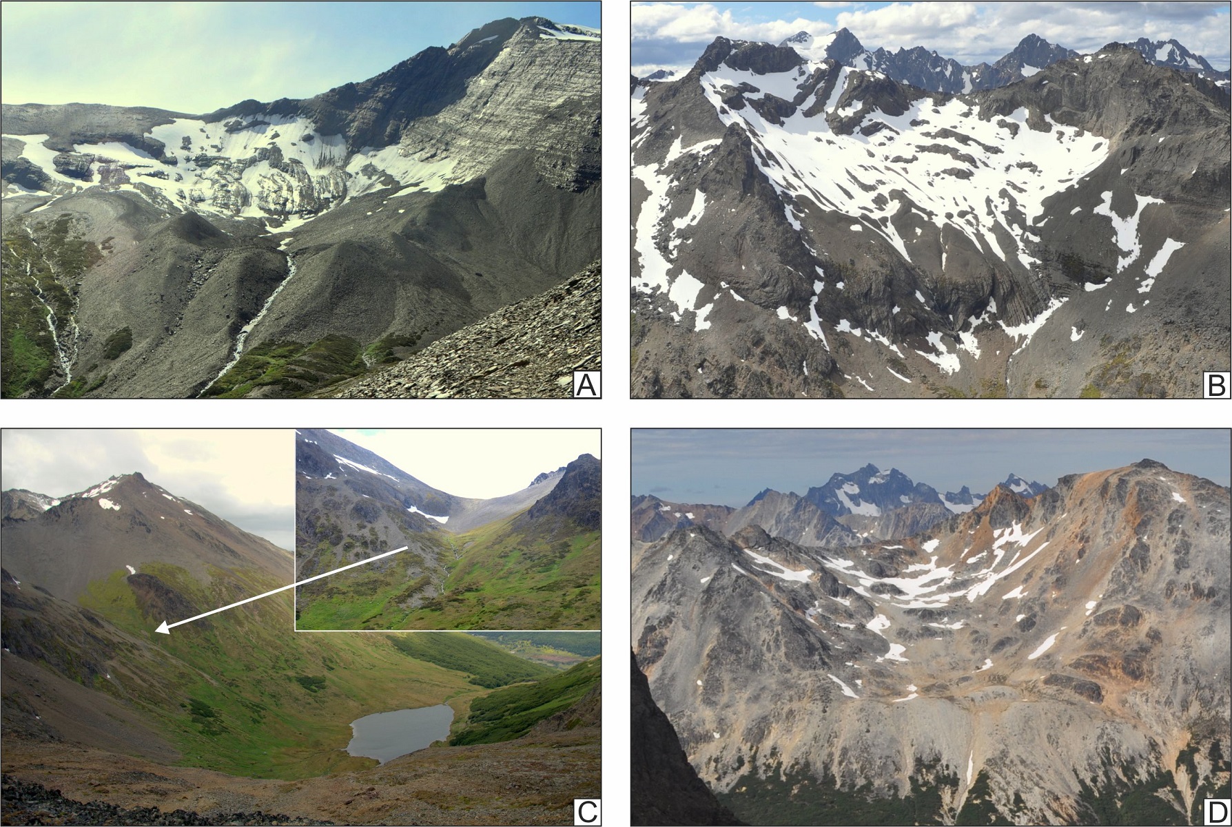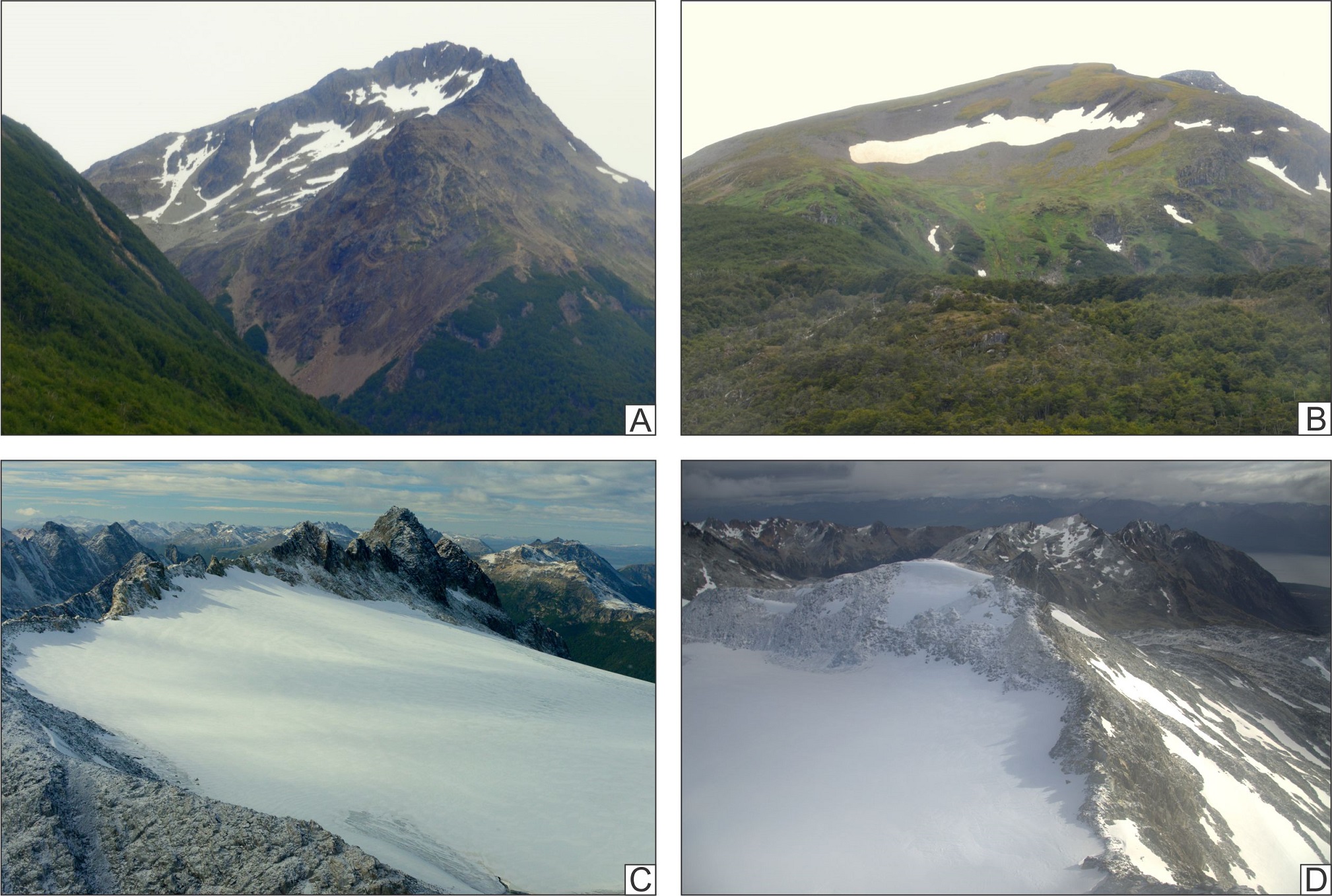 The morphology of this range results from the combined action of the tectonic deformation that still affects the region, and glacial erosion produced during the successive Pleistocene cold events, mainly the Last Glaciation (ca. 85 to 10 ka B.P.; Rabassa, 2008). Glacial cirques constitute a dominant geomorphological feature in the area, delimiting almost the totality of ridges and mountain peaks. A wide network of single glacial valleys crosses the mountain chain, transversely to major longitudinal WNW-ESE trending troughs, tributaries of the Beagle Channel. Hanging valleys, arêtes, horns and truncated spurs are also conspicuous elements in the landscape constitution of this sector (Coronato, 1995, 1996; Planas et al., 2002; Coronato et al., 2009). Latero-frontal morainic arcs are observable in cirques (Planas et al., 2002; Menounos et al., 2013) and in tributary and hanging valleys (Coronato, 1990, 1993, 1995), but they are covered by the forest in the lowlands (Rabassa et al., 2000) (timberline is located at ca. 500-700 m a.s.l.; Puigdefábregas et al., 1988; Strelin and Iturraspe, 2007). Cryogenic landforms (nivation hollows, subnival clast pavements, protalus ramparts, debris lobes, patterned ground and cryo-ejected clasts) abound in the higher portions of mountains (Valcárcel‐Díaz et al., 2006), and the presence of small rock glaciers is frequent within some cirques in the western Fuegian Andes (Vega, 2004; González et al., 2007).