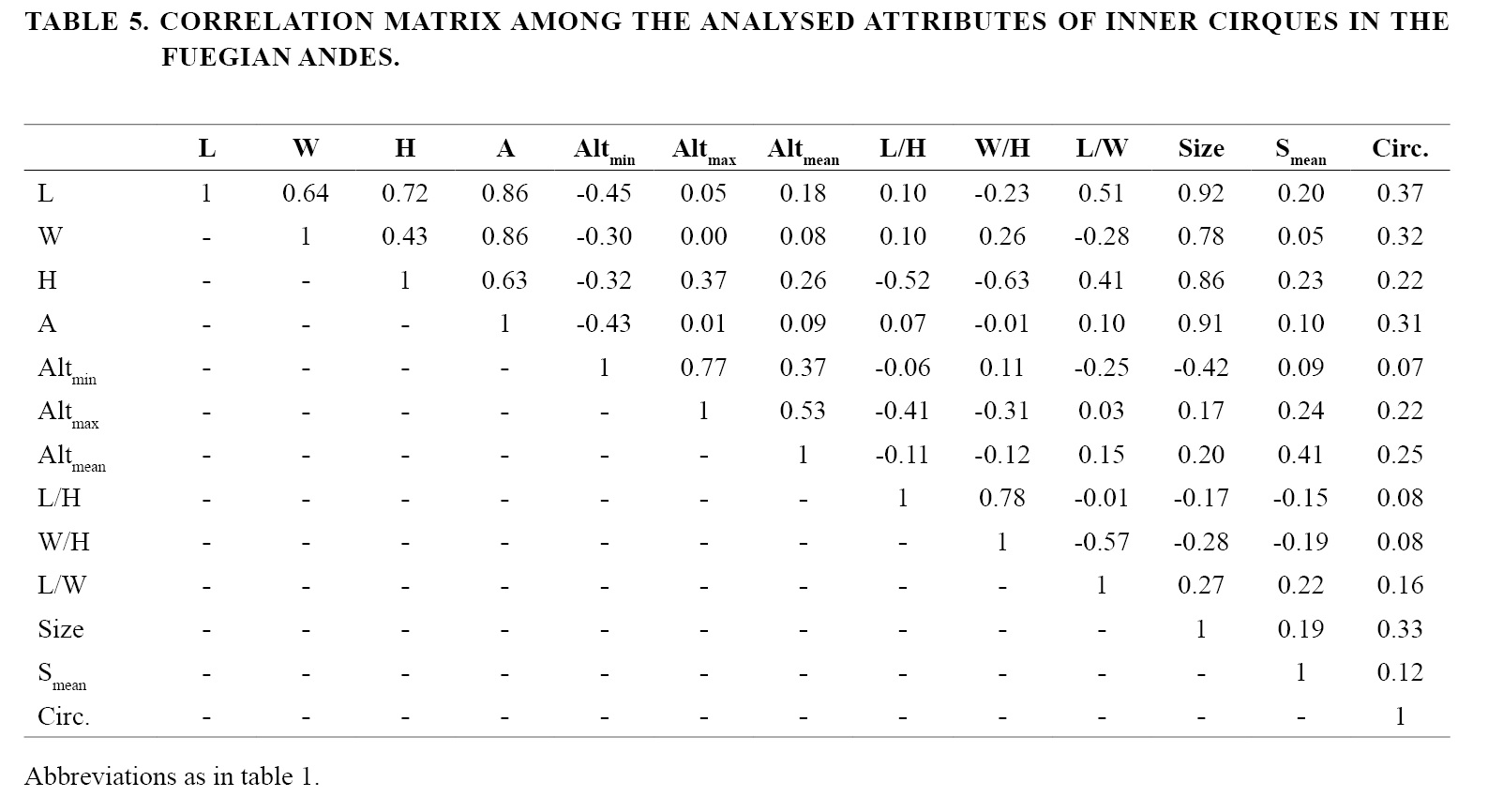 The total cirque set covers the 19.5% of the planar surface encompassed by the mountainous segment considered (intermountain valleys excluded). For 80% of first-order cirques, length (L) ranges from 380 m to 1,410 m (mean L=812 m), width (W) ranges from 360 m to 1,430 m (809 m) height range (H) varies between 167 m to 514 m (332 m) and area (A) falls in the interval between 0.11 km2 and 1.65 km2 (0.66 km2) (Table 2). Two cirques with significantly higher dimensions than the average were identified, with mean A of 6.71 km2, mean L of 2,300 m, mean W of 3,700 m and mean H of 712 m. These cirques were not considered in the statistical analysis of data because of their unrepresentativeness, therefore all tables and correlations are based on the remaining 251 first-order cirques to which is alluded to in this work. Cirques exhibiting larger planar dimensions are concentrated on the eastern portion of the studied range (E half of Sorondo Range), although the two more areally developed cirques in the set are located towards the W, in the Vinciguerra Range. This range and the Martial Mountains contain the majority of cirques with lower areal extent.