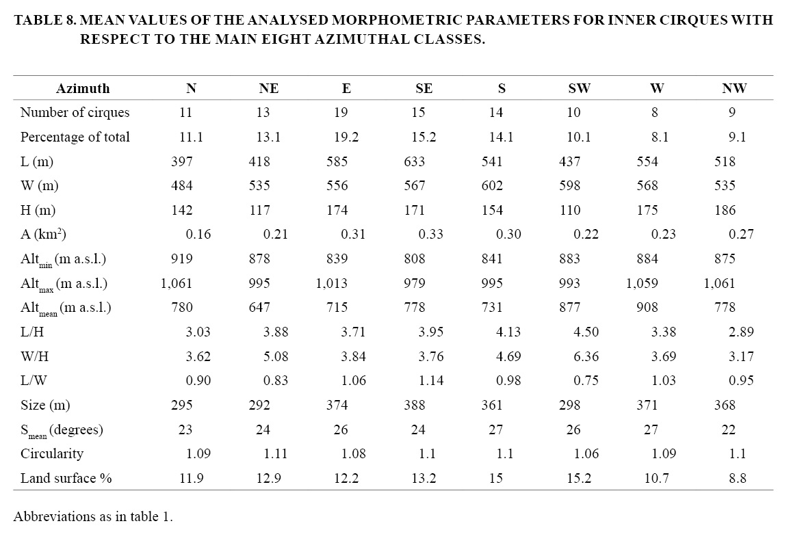 Finally, eastern preference noticed in cirque aspect in the analysed sector could also be accentuated by prevalence of slopes exposed to the S, SE and E (40.4% of the total area; 55% of cirque population) over those facing N, NW and W, the most climatically adverse aspects (31.4%; 20.72%) (Table 7).