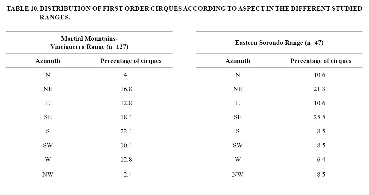 This analysis provides additional evidence in support of the important role that structure would have played in the arrangement of glacial valleys in the area; however, it should be kept in mind that northeastward and southeastward valley aspects in north and south flanks of the range, respectively, are also the most climatically favoured, implying that both elements, structure and climate, would have ruled trough orientation jointly. Whatever the relative weight of causes responsible for valley framework configuration described above, it is evident that this acted as a significant preconditioning in cirque aspect, as these occur profusely (79.8% of the total set) in valley margins. Nevertheless, it is noticed that cirques are not equally distributed among both flanks of the interfluves, but show prevailing eastern aspects: along SW-NE/SSW-NNE trending main ridges, cirques face dominantly to the SE and SSE, and when occupy divides with NW-SE/NNE-SSE directions, they usually have NE and E aspects (Fig. 1B). These patterns would be indicating some predominance of insolation and westerly winds effects over topography and bedrock structure on cirque development, since E-W/WNW-ESE strike transcurrent faults and W-E to NW-SE strike rock bedding should also have promoted formation of cirques with westerly aspects, which only occur in a limited way. In the area covered by Martial Mountains and Vinciguerra Range (127 cirques), for example, the two ridge direction trends observed (NW-SE/NNE-SSE and SW-NE/SSW-NNE) likely propitiated occurrence of cirques facing S (22.4%) and SE (18.4%), as well as a comparable concentration of NE-facing cirques (16.8%), but N (4%) and NW (2.4%) aspects are scarce (Table 10), suggesting that structural control was important, but overshadowed by climate effect. On the other hand, topographic forcing over solar radiation effect seems to be clear in eastern part of Sorondo Range (47 cirques), which despite having lower elevations -that should restrict cirques to the most climatically favourable aspects, since glacial asymmetry increases with decreasing glacial cover (Evans, 1977; Olyphant, 1977)-, presents equivalent dominant cirque orientations as Martial Mountains and Vinciguerra Range: SE (25.5%) and NE (21.3%), as well as a strikingly low percentage of poleward-facing cirques (8.5%) (Table 10). This could be explained by comparatively more marginal glacial conditions in that sector, which would have limited to some degree the modification of the pre-glacial landscape by ice erosion.