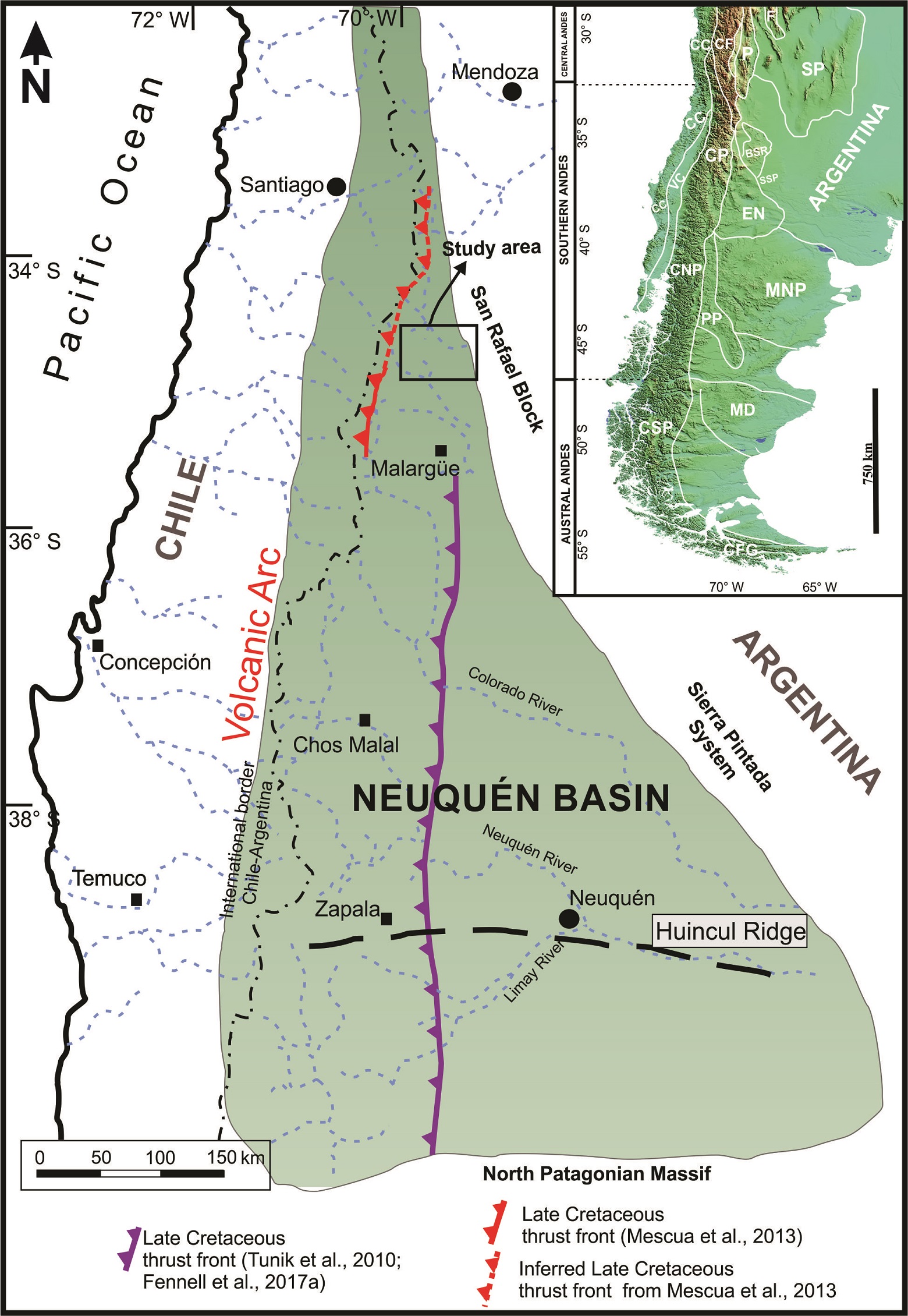 The basement of the basin is known as the Choiyoi Group, a Permian-Triassic rhyolitic-dacitic rock sequence interbedded with clastic successions. This unit represents the transition from a magmatic arc setting towards an extensional within-plate regime along the southwestern Gondwana margin (Llambías et al., 2003; Martínez and Giambiagi, 2010; Fennell et al., 2017a). The infill of the basin started in the Late Triassic-Lower Jurassic with the development of isolated hemigrabens controlled by normal faults. Synrift deposits consist of volcanic, volcaniclastic and sedimentary rock successions deposited in a series of isolated depocenters (Legarreta and Gulisano, 1989; Cristallini et al., 2009; Giambiagi et al., 2009). With the connection of these isolated depocenters, the Early Jurassic records the first marine transgression from the Pacific. The full cycle is represented in the basin by the intercalation of marine sandstones, shales and evaporites (Gulisano and Gutiérrez Pleimling, 1994). A second transgressive-regressive cycle took place in the Late Jurassic-Early Cretaceous and is represented by sedimentary rock sequences included in the Mendoza and Bajada del Agrio Groups. The Titho-Neocomian Mendoza Group includes different units composed by marine organic black shales rich in organic matter, thinly laminated limestones and sandstones, grading-up and interfingering with nonmarine redbeds and evaporites of the Bajada del Agrio Group (Tunik et al., 2010 and references therein). The Bajada del Agrio Group (Huitrín and Rayoso formations), marks the disconnection of the Neuquén Basin from the Pacific Ocean and the beginning of the continentalization of the basin (Leanza, 2003 among others). During the Late Cretaceous, the Neuquén Basin evolved into a foreland stage, reflected by the beginning of a new sedimentation cycle represented by sedimentary rocks of the Neuquén Group. The inception of a compressional regime in Late Cretaceous times, coincident with a major tectonic plate reorganization, controlled the Late Cretaceous to Cenozoic paleogeography (Somoza and Zaffarana, 2008; Tunik et al., 2010; Orts et al., 2012). A new transgression took place from latest Cretaceous to Paleocene times, this time from the Atlantic Ocean, which is represented by the sedimentary rocks of the Malargüe Group (Aguirre Urreta et al., 2011). The foreland basin stage was interrupted between late Oligocene and early Miocene times, but resumed in the middle Miocene, when the last major contractional stage became responsible for the final shaping of the Southern Central Andes at these latitudes (Fennell et al., 2017a and references therein).