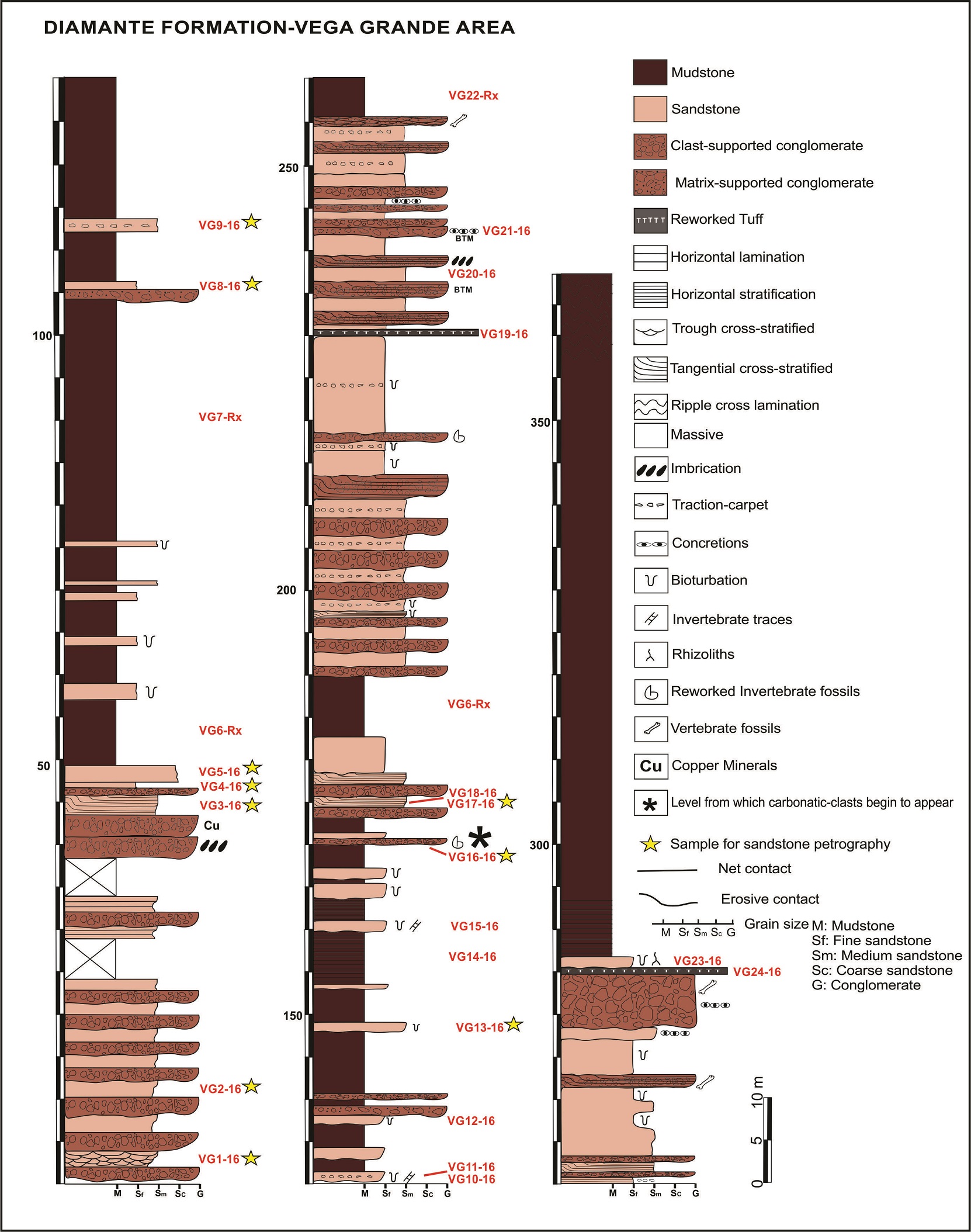 In the area of Vega Grande, the Diamante Formation outcrops with a thickness of 377 m. Its base is covered and towards the top a transitional passage to shallow marine deposits of the Saldeño Formation is recorded (Tunik, 2001). In this area, the unit is divided into two upward-fining and thinning rock sequences, composed by clastic deposits in which conglomeratic, sandy and mudstone facies were identified (Fig. 3).