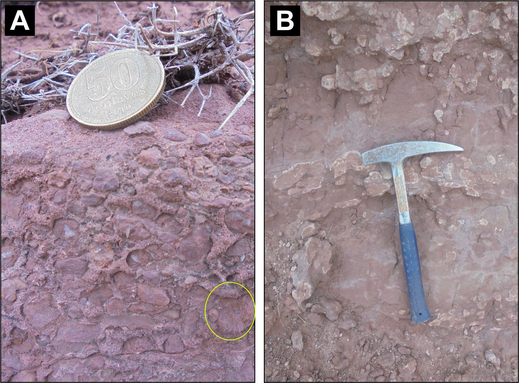 The channels and bars association (FAI) is evidenced by the presence of strata with lenticular and in some cases tabular and chaotic geometry, of variable extension and thickness. The basal contact of this facies association is erosive, followed by conglomerates and medium to coarse-grained sandstones, mainly massive with tangential and festoon cross-bedding with restricted levels with imbricated clasts (Fig. 4). Different sedimentary rock bodies were observed in this facies association, assigned to deposits of: non-channelized floods, hyper-concentrated flows, non-channelized viscosity flows, channel and transverse-longitudinal bars (Miall, 2014) (Fig. 5). Regarding the channelized deposits, both the predominance of the massive facies and the scarce levels with imbricated clasts hindered the paleocurrent measurement in the Vega Grande section (Figs. 4C-D). The channel-stacking and the presence of cut and fill structures represent the superposition of several events, reflecting the presence of multiepisodic filling of channels. The lateral development of the channels is limited to a few dozen meters. No lateral accretion surfaces were observed; however, the conglomerate and sandy facies with current sedimentary structures (Gct, Sp) suggest the filling of channels with longitudinal or transverse bar formation. The lack of 3-D channelized bodies makes it difficult to observe or define the type of bar. Bioturbation, mottling, carbonate nodules and calcrete levels on the most fine-grained facies are common. Traces assigned to Scoyenia, Taenidium, Arenicolites, Skolithos, Rhizoliths and horizontal and vertical undifferentiated tubes have been identified (Fig. 4B, E-F and Fig. 6B). The non-channelized floods and viscosity flow deposits are common along the entire sequence. One of the features of these deposits is the presence of isolated 2 to 5 cm long clasts in beds that present a diffuse lamination or stratification (Fig.4D). One of the particularities of this facies association is the difference observed in clast composition. In the lower levels of the section, the conglomerates are essentially composed by volcanic rock clasts, while towards the top there are many limestone clasts and scarce undifferentiated and reworked fossil invertebrates (Fig. 6A). The presence of limestone clasts is also identified and verified in the petrography of sandy levels.