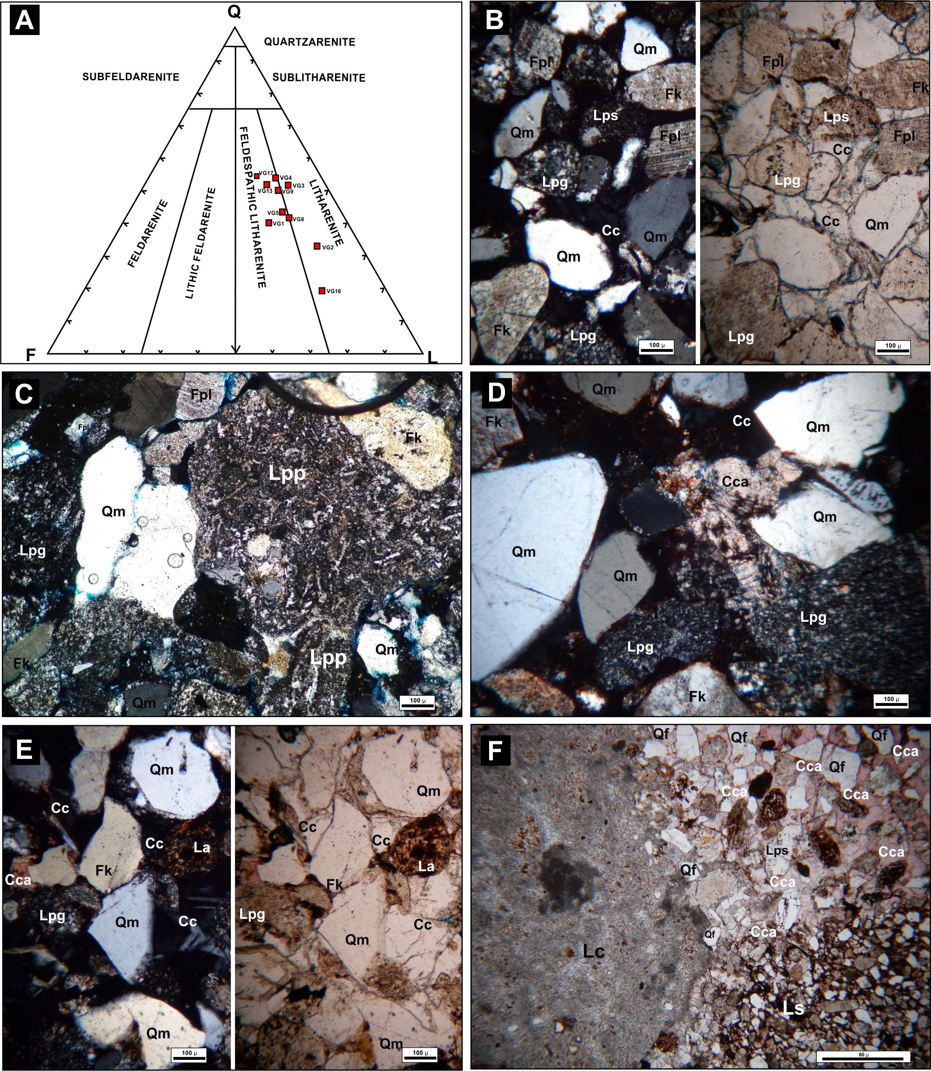 The lithic fragments make up for 41% of the clastic fraction, a high average percentage compared to the quartz and feldspar. These characteristic were also noticed by Balgord and Carrapa (2016) for the rocks of the Diamante Formation located around 100 km to the south. The lithics have an angular to subangular shape, they appear in varied sizes (on average 0.5-10 cm), and mainly belong to volcanic rocks, more specifically paleovolcanic, according to the criteria of Critelli e Ingersoll (1995). In almost all of the samples, fragments of volcanic rocks with felsitic, granular, micro granular and serial textures were predominant, although volcanic fragments with pilotaxic texture and pyroclastic fragments were observed to a lower extent. In addition, great proportions (34.5%) of calcareous lithic fragments in the mid part of the section (sample VG16) were recognized. Large amounts of altered lithic fragments and pseudomatrix (VG2) were also identified. Sedimentary lithic grains, metamorphic rock fragments and plutonic rock clasts were also observed in low proportions. The most common type of cement is calcareous, followed by zeolitic, ferruginous and argillaceous types. Cement occurs as pore filling, pore lining and scarce poikilotopics (Fig. 8E). The alizarine red and potassium ferricyanure stain allowed establishing that carbonate cement is non-ferrous calcite. The average percentage of zeolitic cement in the samples is low (2%), but in some samples such as VG9 and VG8, that percentage rises due to the presence of analcime occurring as pore filling cement and in subhedral crystals related to calcite cementation (Fig. 8D).