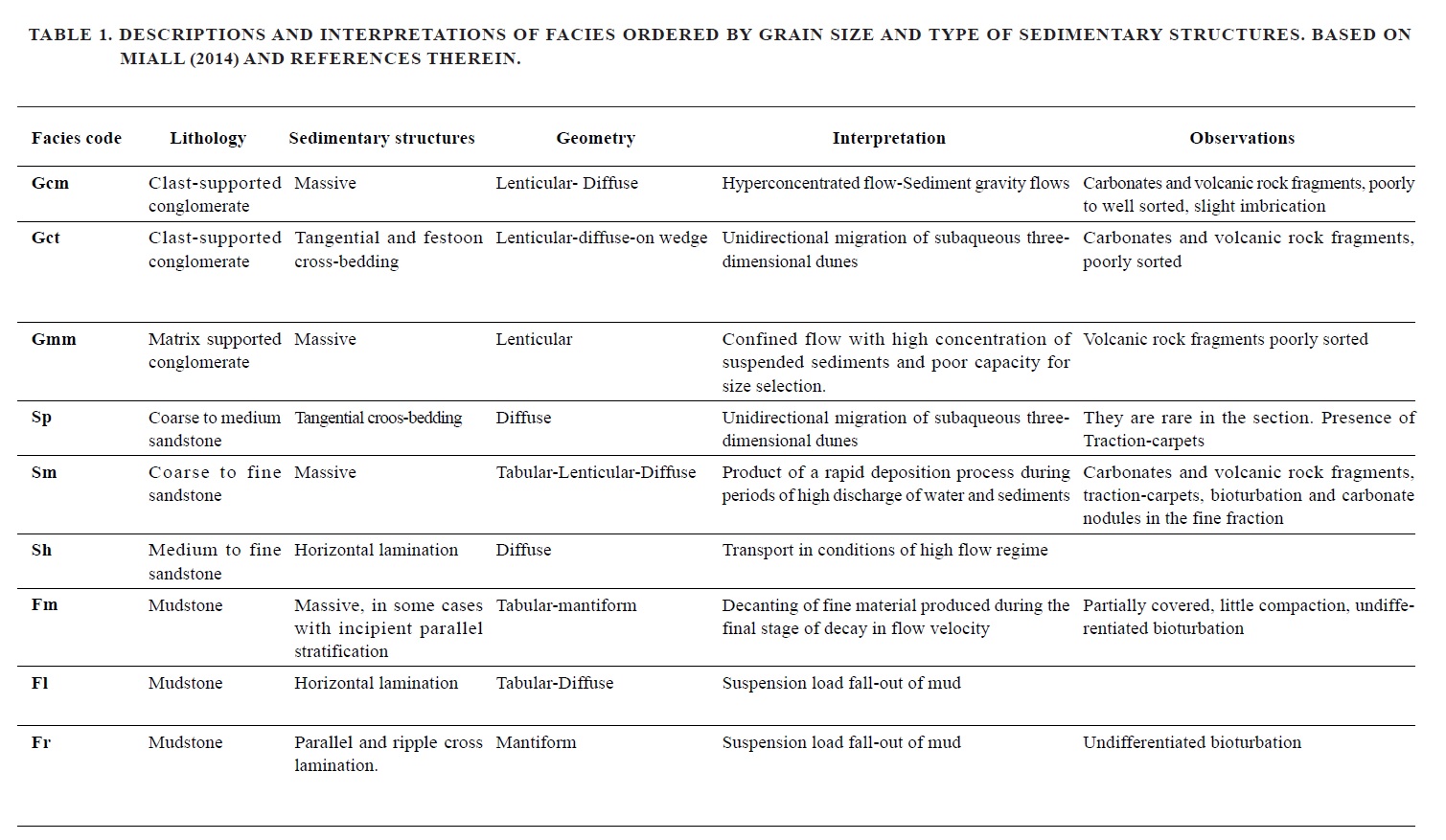 Nine facies were established (Table 1, Gómez et al., 2016a, b). Conglomeratic facies of variable lateral extension (from 1 to 14 m) and thickness (up to 5 m) present lenticular and chaotic geometries. Clast-supported orthoconglomerates (Gcm, Gct) are the most abundant facies while matrix-supported orthoconglomerates (Gmm) are present in a lower proportion. They crop out as continuous depositional cycles that begin with coarse-conglomeratic, followed by coarse-sandstone facies and finish with medium to fine sandstone facies (Sp, Sm) with bioturbation (Sm). The sandstone facies not only appear associated with conglomeratic facies, but also appear showing both the ribbon and sheet geometries as individual bodies (Sp, Sm, Sh). On the other hand, mudstone facies are represented by tabular and sheet geometries, often semi-covered and with an important thickness (from 1 to 80 m) representing the major type of deposit in Vega Grande area (Fm, Fl, Fr).