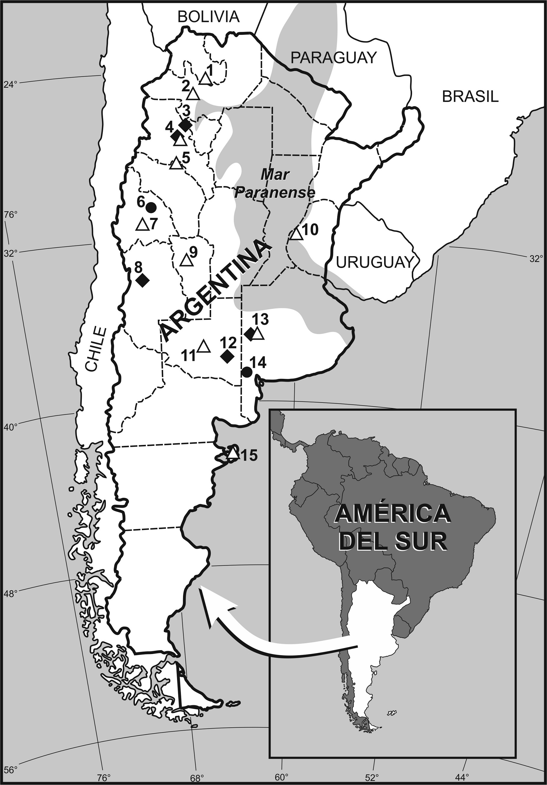FIG. 1. Mapa de Argentina con la ubicación geográfica de las localidades mencionadas en el texto. 1. Los Alisos, Jujuy; 2. Valle de Tonco, Salta; 3. Valle de Santa María, Catamarca; 4. Corral Quemado, Catamarca; 5. El Degolladito, La Rioja; 6. Sierra de Mogna, San Juan; 7. Loma de las Tapias, San Juan; 8. Huayquerías de San Carlos, Mendoza; 9. Cantera Díaz Nogarol, San Luis; 10. Paraná, Entre Ríos; 11. Cerro La Bota, La Pampa; 12. Salinas Grandes de Hidalgo, La Pampa; 13. Lagunas Encadenadas del Oeste, Buenos Aires; 14. Arroyo Chasicó, Buenos Aires; 15. Península Valdés, Chubut; círculo negro: Lagostomus telenkechanum; rombo negro: L. pretrichodactyla; triángulo blanco: Lagostomus. Distribución del mar Paranense, transgresión marina del Mioceno tardío, sombreado en gris claro (según Aceñolaza, 2000).