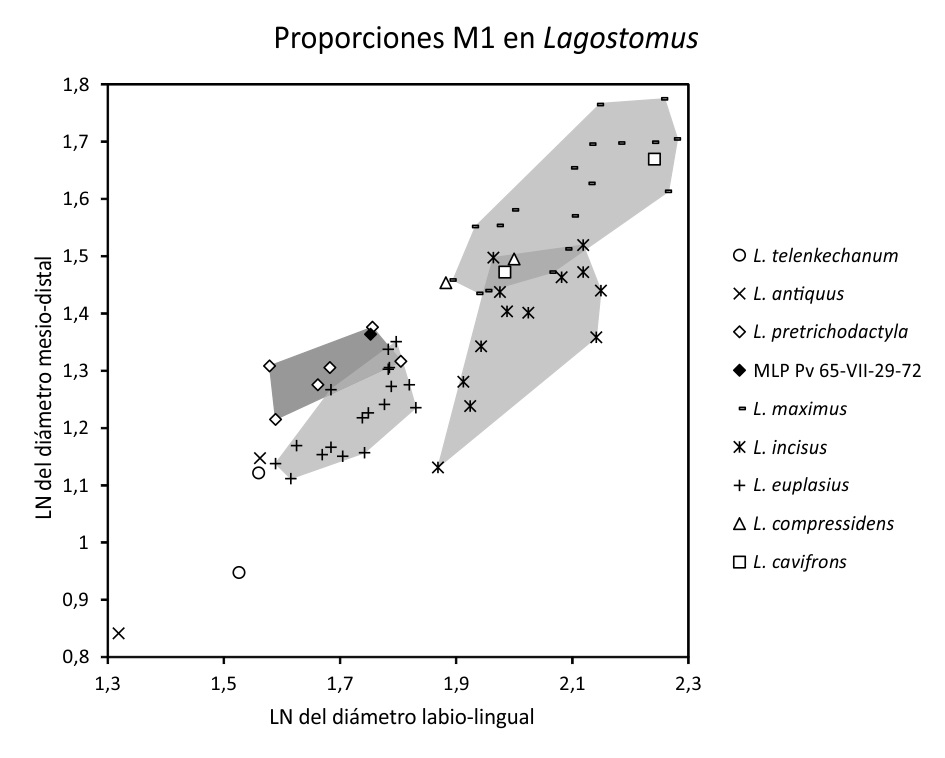Las proporciones de los molariformes superiores son semejantes a aquellas de los especímenes de Lagostomus pretrichodactyla reportados por Rovereto (1914) y Marshall y Patterson (1981) para la provincia de Catamarca (ver Tabla 2 y Figs. 5C, 5D, 5H y 6), aunque son menos comprimidos mesio-distalmente que los de L. telenkechanum, L. euplasius y L. incisus; se asemejan a los de L. compressidens, L. cavifrons y L. maximus.