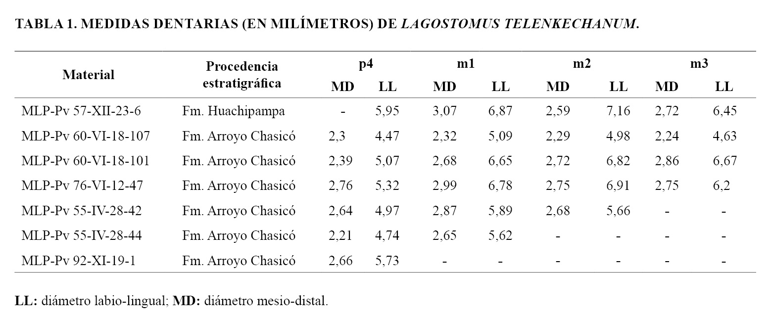 Las proporciones y los tamaños de los molariformes son comparables a los del material referido de Lagostomus telenkechanum proveniente de la Formación Arroyo Chasicó (ver Tabla 1 y Figs. 3C, 3D, 3F y 4), aunque son más comprimidos mesio-distalmente que los de L. pretrichodactyla, L. compressidens (Ameghino, 1908), L. debilis Ameghino, 1889, L. minimus Ameghino, 1889, L. heterogenidens Ameghino, 1889, L. cavifrons Ameghino, 1889, L. egenus Ameghino, 1891b y L. maximus, y menos que los de L. incisus; es decir, son similares a los de L. antiquus y L. euplasius.