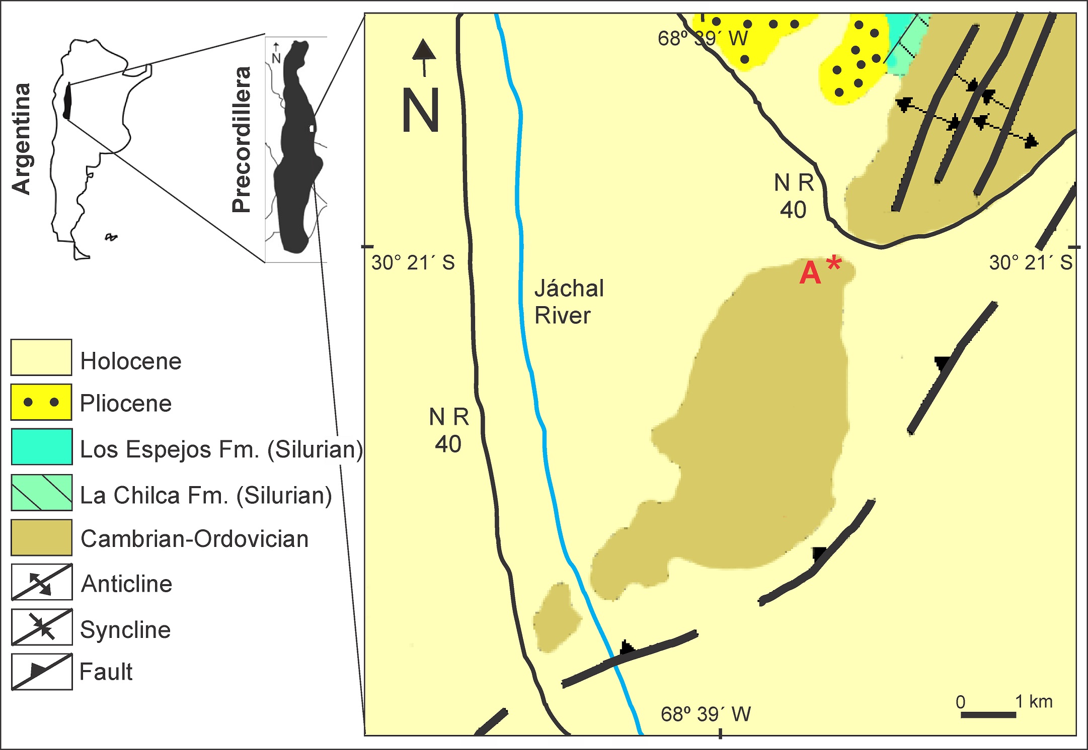 The Precordillera is located between 28°30ʹ and 33° S and 68°15ʹ and 69°45ʹ W, partly covering the La Rioja, San Juan and Mendoza provinces. This geological province includes extensive Paleozoic outcrops and, to a lesser extent, Mesozoic and Cenozoic rock units. On the basis of its stratigraphic and structural characteristics, the Precordillera is subdivided into three morphostructural units: Eastern (Ortiz and Zambrano, 1981), Central (Baldis and Chebli, 1969) and Western Precordillera (Baldis et al., 1982).
