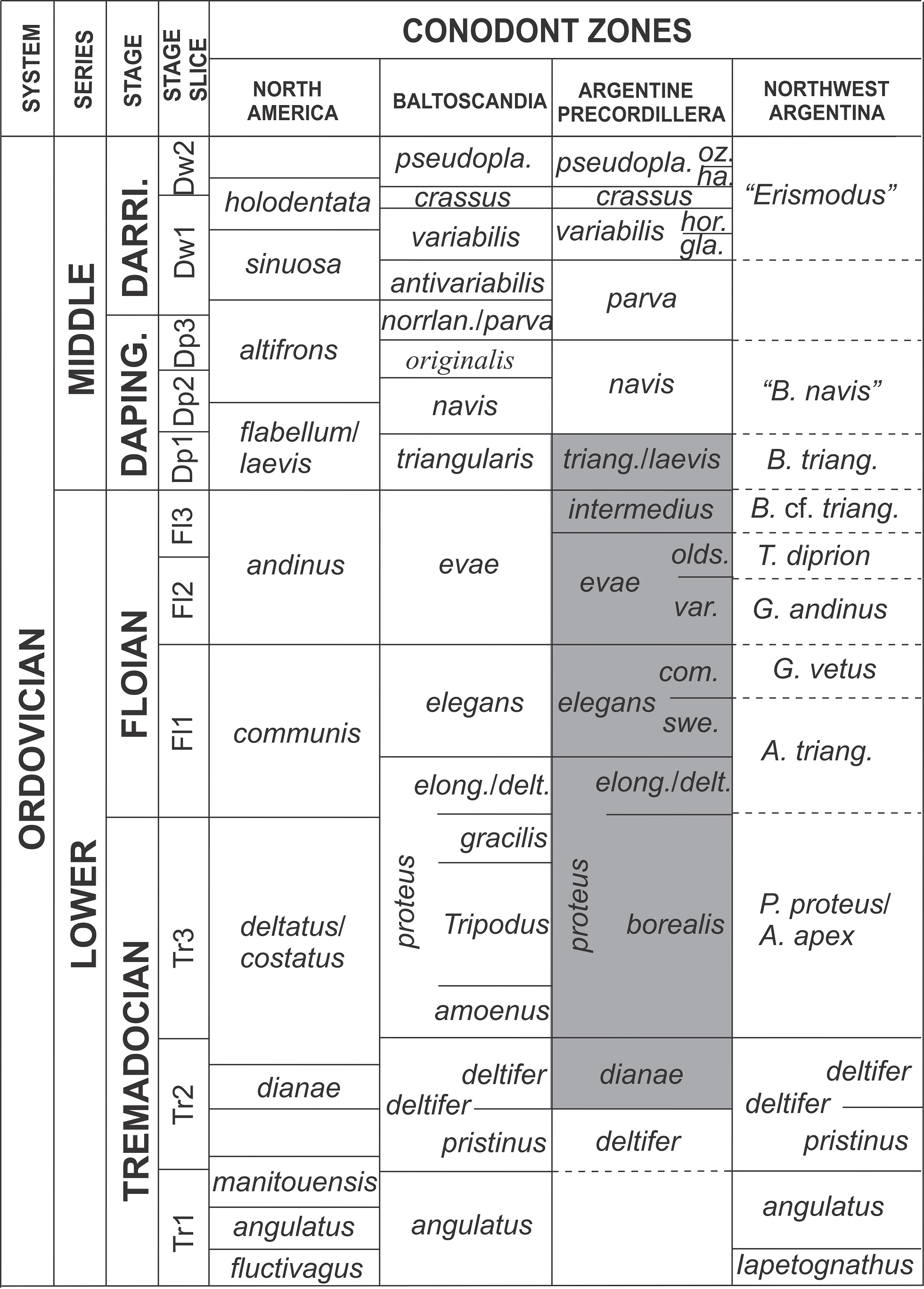 FIG. 3. Chronostratigraphic scheme of the Tremadocian-Darriwilian stages (Lower-Middle Ordovician), with conodont zones of North America, the Baltoscandian region, the Precordillera and Northwest Argentina (modified from Albanesi and Ortega, 2016). In gray the time span considered in this work.
