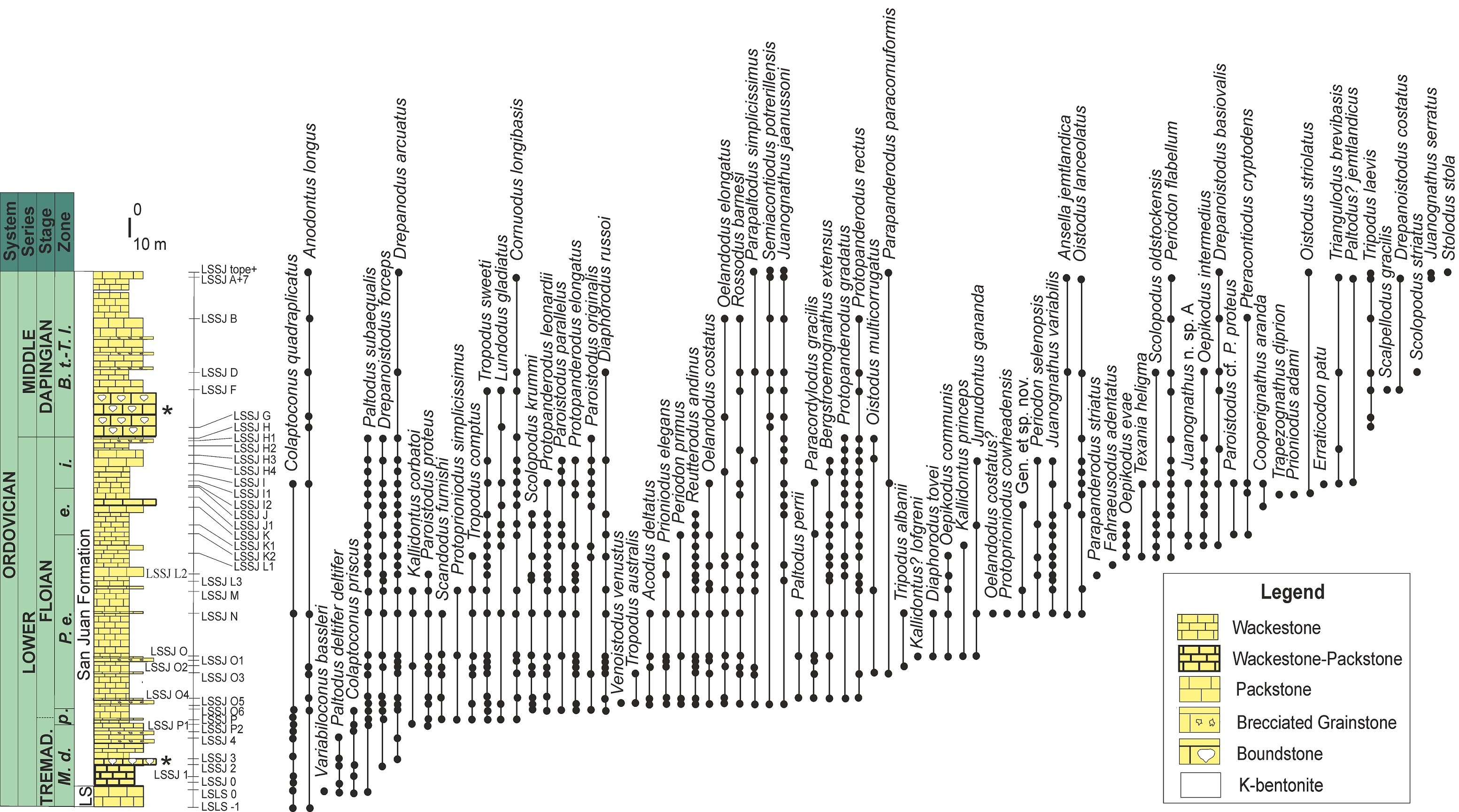 This zone is recognized from the sample LSSJ K2 by the occurrence of Oepikodus evae (Fig. 5) to the sample LSSJ J (Fig. 4), where Oepikodus intermedius (Serpagli) appears not associated to Oepikodus evae. In this section, the species Juanognathus variabilis Serpagli and Scolopodus oldstockensis Stouge are recorded throughout the zonal interval, though according to the reference biostratigraphic scheme by Albanesi and Ortega (2016) it would correspond to the Oepikodus evae-Scolopodus oldstockensis Subzone of Albanesi et al. (1998). The division of the zone will be discussed in detail under the discussion part. The local thickness of this zone is 23.9 m.