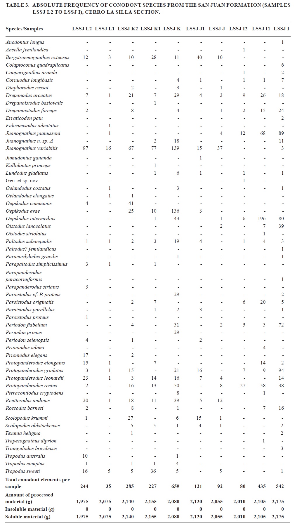 These samples yield a high diversity and abundance of conodonts, with the record of Juanognathus jaanussoni Serpagli, Semiacontiodus potrerillensis Albanesi, Parapaltodus simplicissimus Stouge, Oelandodus elongatus (Lindström), Rossodus barnesi Albanesi, Reutterodus andinus Serpagli, Tropodus australis (Serpagli), Oelandodus costatus van Wamel, Bergtroemognathus extensus Serpagli, Acodus deltatus (Lindström), Periodon primus Stouge and Bagnoli, Ansella jemtlandica (Löfgren), Oistodus lanceolatus Pander, Parapanderodus paracornuformis (Ethington and Clark), Protopanderodus rectus (Lindström), Protopanderodus gradatus Serpagli, Paracordylodus gracilis Lindström, Oistodus multicorrugatus Harris, Periodon selenopsis (Serpagli), Jumudontus gananda Cooper, Parapanderodus striatus (Graves and Ellison) and Oepikodus communis.